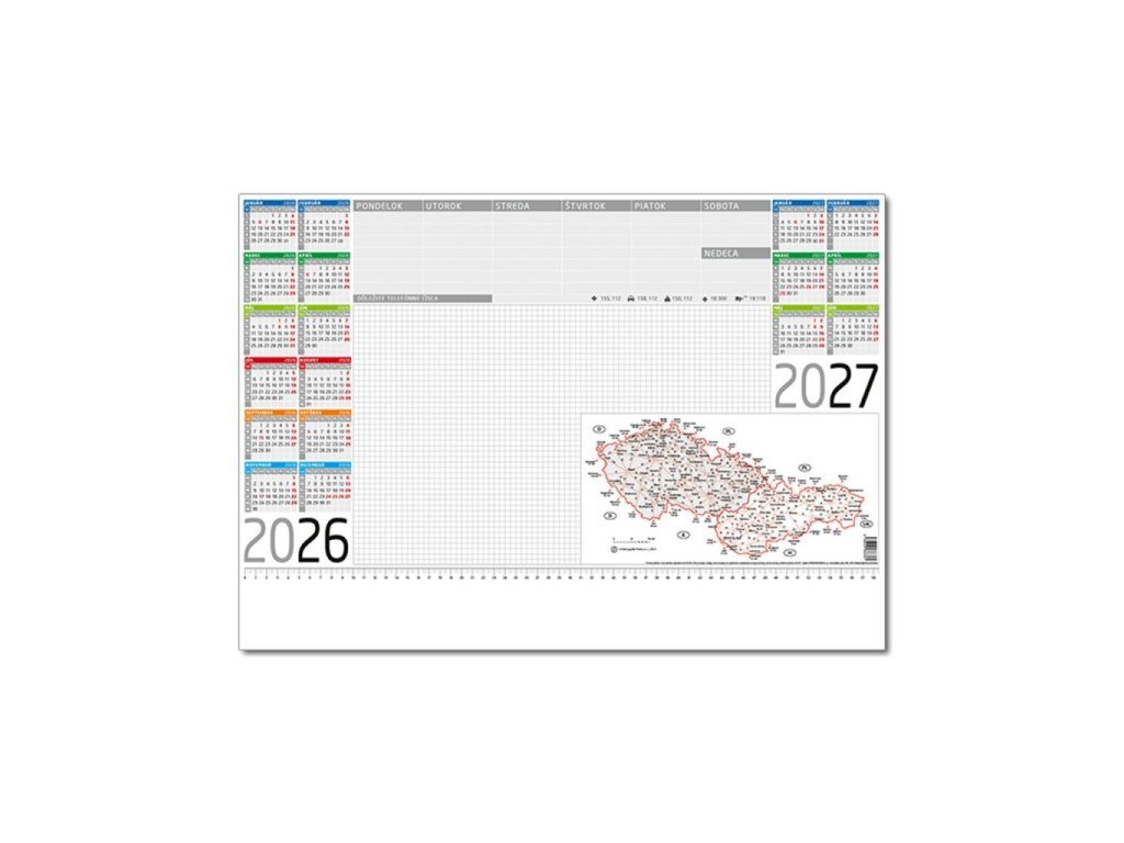 Ideálny doplnok v kancelárii na Váš pracovný stôl. Podložka obsahuje univerzálne týždenné kalendárium aj kalendárium na rok 2026 a prvých 6 mesiacov v roku 2027 ako aj prehľadnú mapu vzdialeností v Čechach a na Slovensku. Podložka je doplnená o transparentnú plastovú spodnú lištu, ktorá je ideálna na reklamnú potlač.Formát: 595 x 420 mm