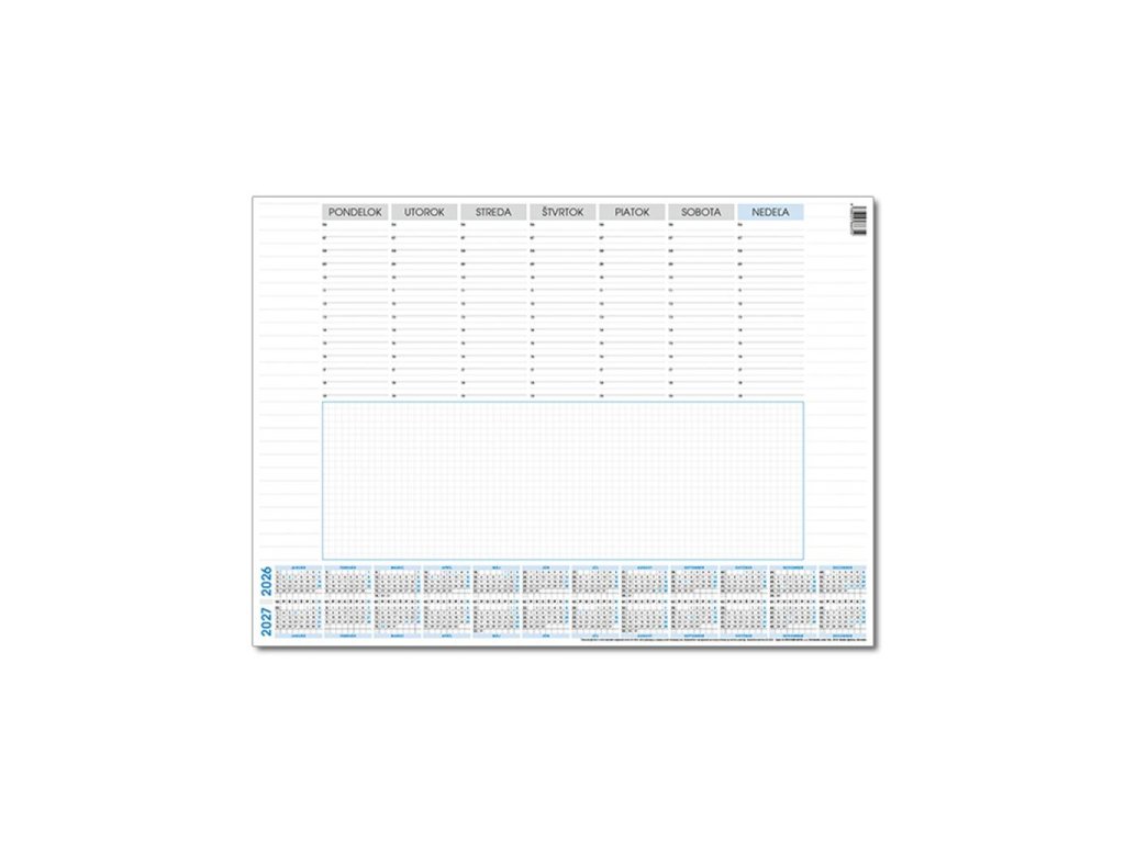 Ideálny doplnok na každý pracovný stôl! Podložka obsahuje týždenné kalendárium určené na zapisovanie jednotlivých poznámok v konkrétnom dni. V dolnej časti nájdete prehľadné dvojročné kalendárium na roky 2026 a 2027, vďaka ktorému máte všetky dôležité dátumy vždy poruke. Podložka je doplnená o transparentnú plastovú spodnú lištu, ktorá je ideálna na reklamnú potlač. Vhodná pre firmy ako praktický a zároveň reprezentatívny darček.Rozmery: 470 x 340 mm