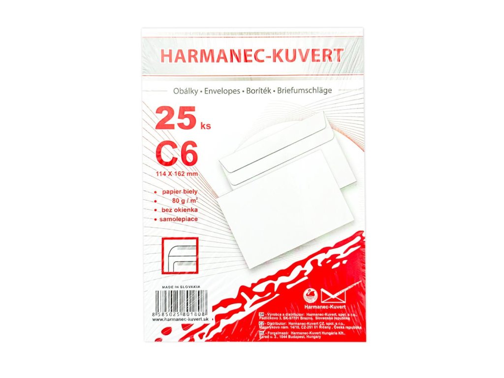 Biele obálky rozmeru 114 × 162 mm, vyrobené z bezdrevného papiera, 80 g/ m2. Samolepiace.Formát: C6