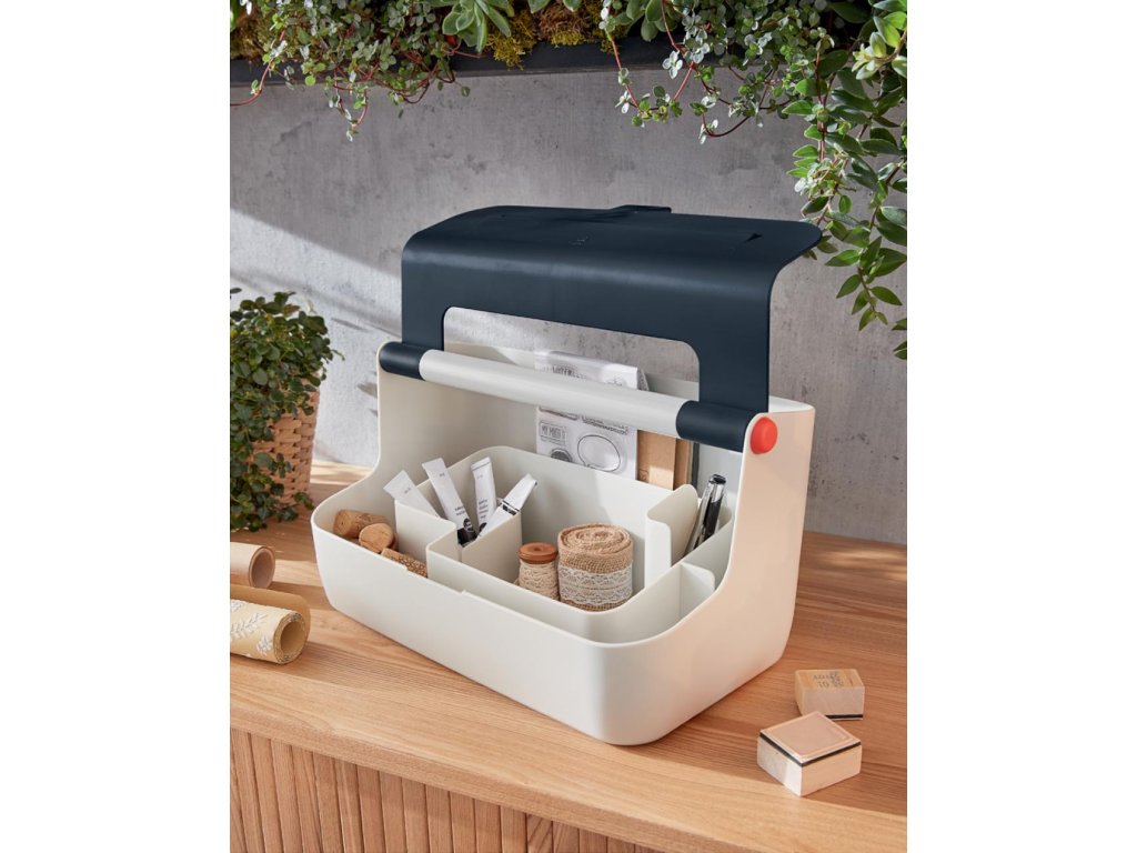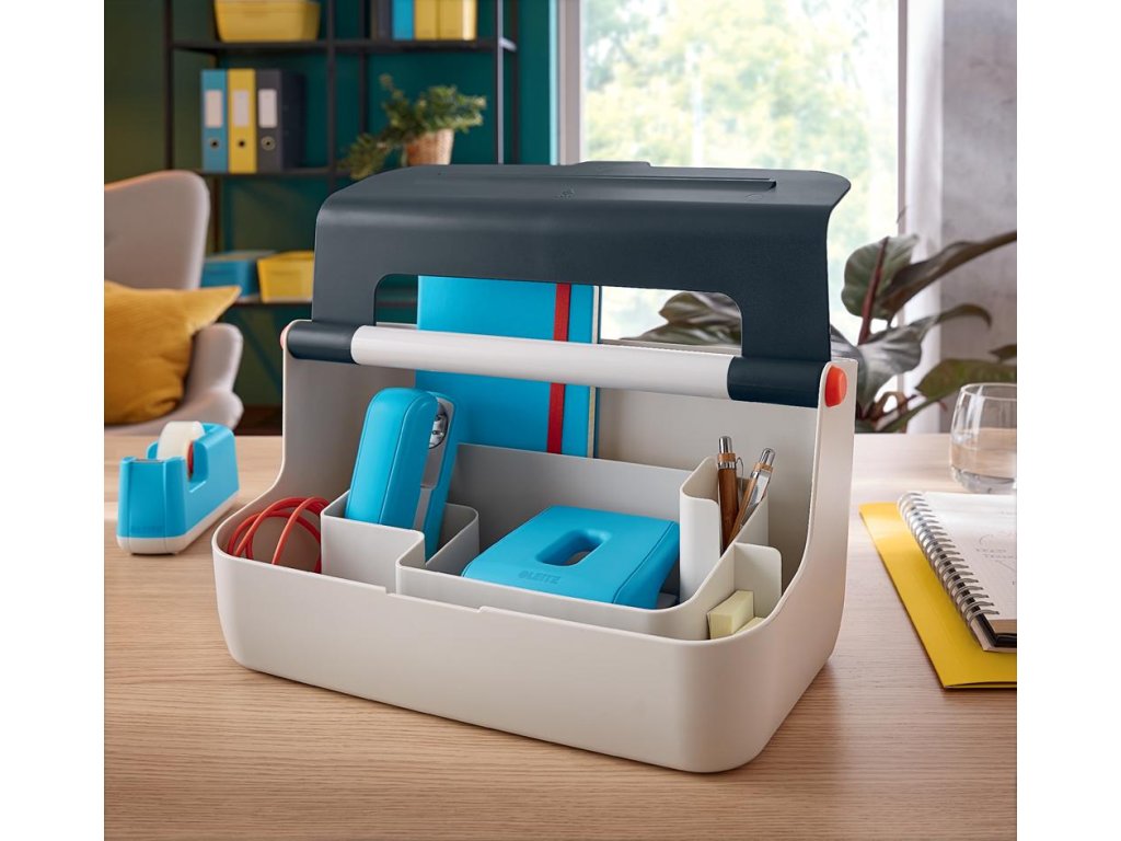 Ľahký a ľahko prenosný úložný box vďaka robustnej rukoväti vystuženej hliníkom. Veko poskytuje uprataný vzhľad a väčšie súkromie, ale dá sa doširoka otvoriť pre ľahký prístup k obsahu. Inteligentné delenie priehradky pre lepšiu organizáciu a rýchly prístup k pomôckam, široká zadná priehradka na uloženie dokumentov veľkosti A4. So zdvihnutímv hornej časti veka na uloženie vášho smartfónu / tabletu, aby ste mali svoje mobilné zariadenia stále na očiach. Vyrobené z odolného ABS materiálu pre každodenné použitie, ľahko utierateľné. Farba sivá.