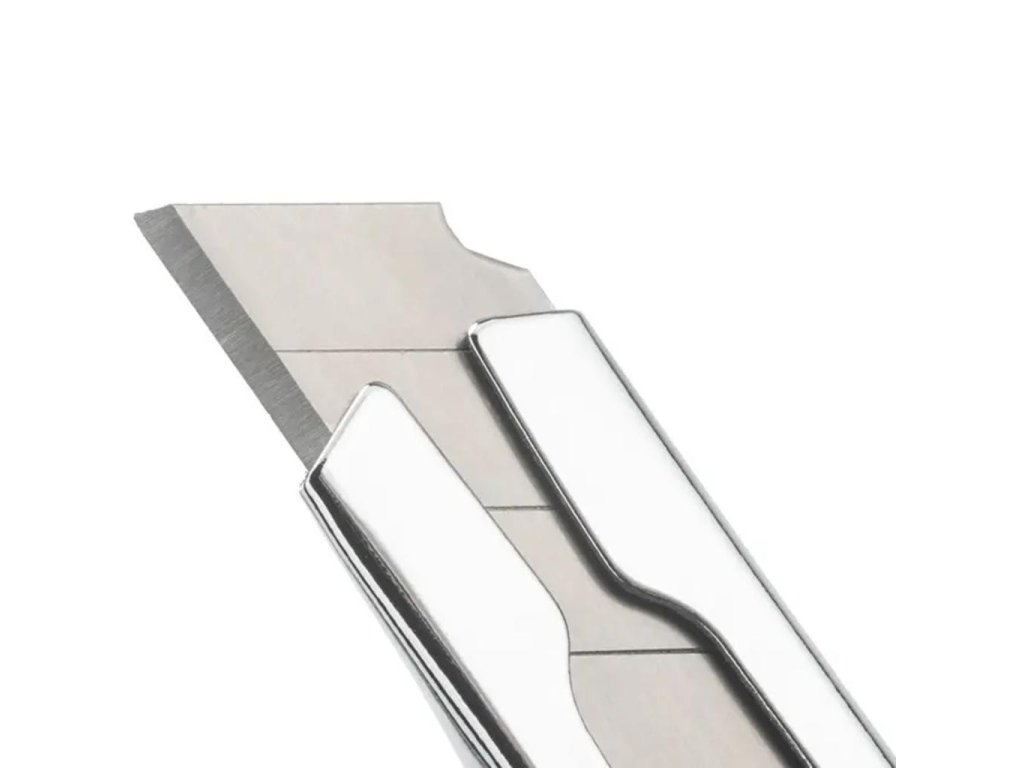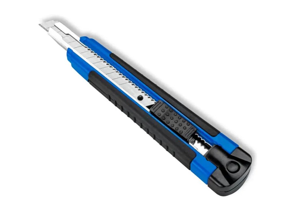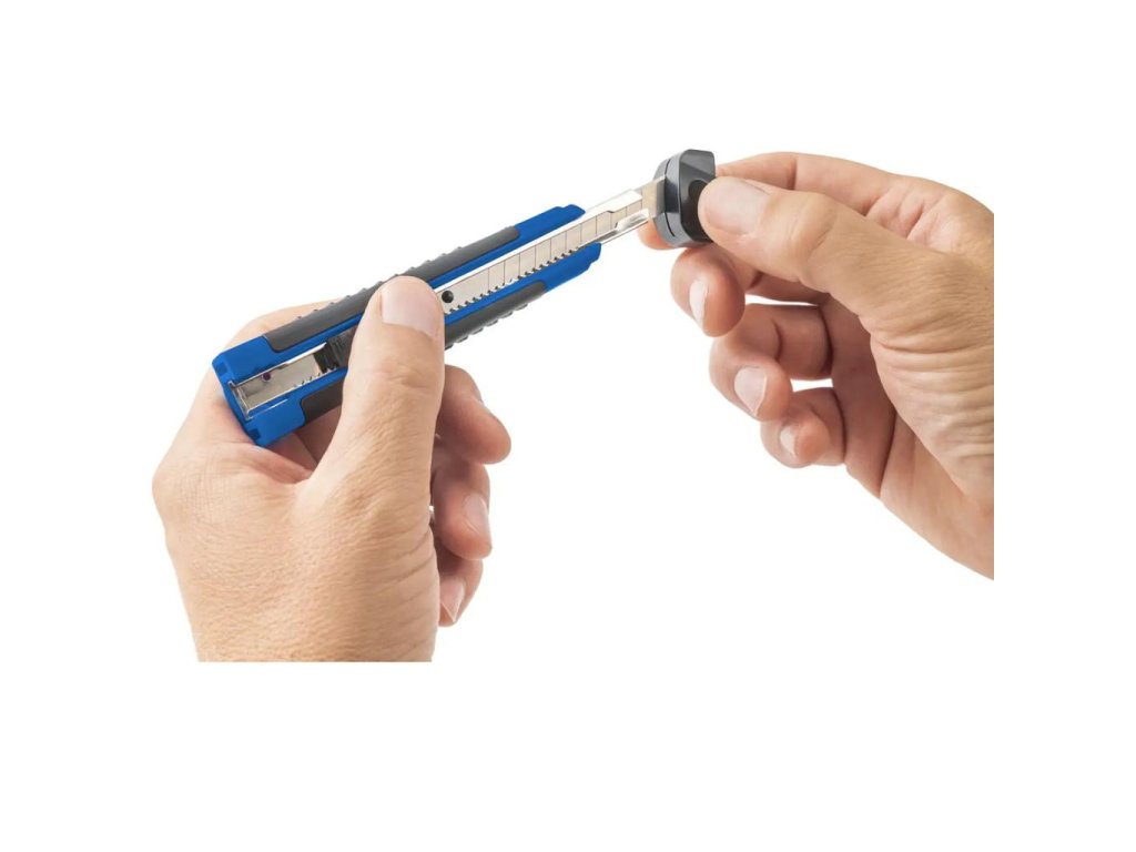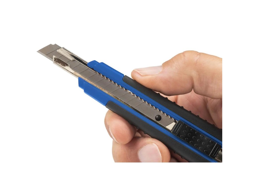 Protišmykový univerzálny rezač na rýchle a ostré rezy s odlamovacím nožom, kovovou čepeľou a aretáciou. Profi model stredný so šírkou čepele 9 mm má nôž rozdelený na 12 častí. Vďaka integrovanej funkcii odlamovania čepele v rukoväti budete mať vždy ostrú čepeľ. Rezač perfektne a bezpečne padne do ruky vďaka ergonomicky tvarovanej gumenej rukovätiModel je dodávaný s 1 nožom a s 2 náhradnými čepeľami navyše.Farba modrá.