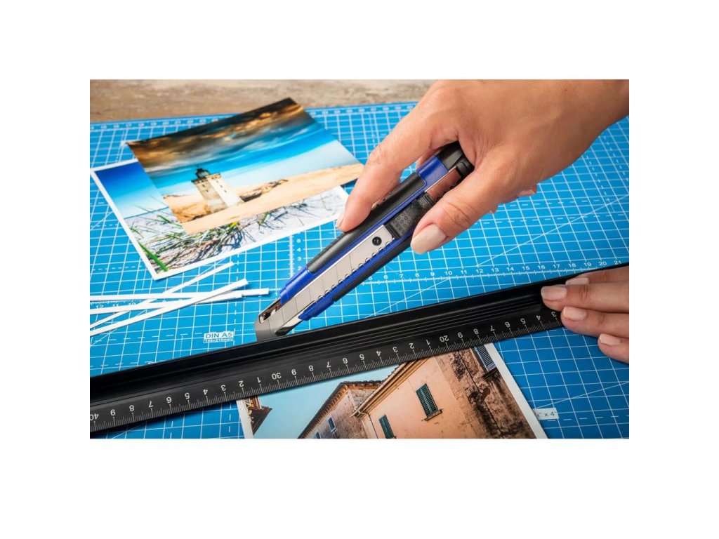 S kovovým vedením čepele pre bezpečnú manipuláciu a kontrolované rezy.