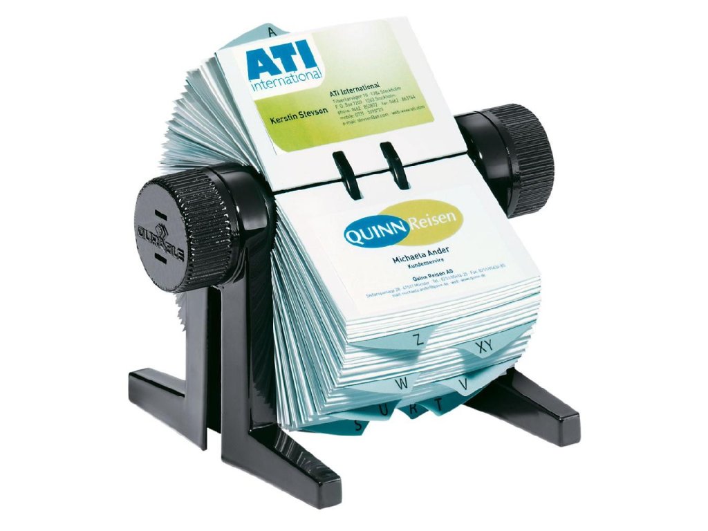 Praktický rotačný vizitkár s rozraďovačom. Vyrobený z kvalitného plastu. Obsahuje 150 obojstranných vreciek rozmeru 72 × 104 mm a abecedný rozraďovač s 25 oddielmi. Kapacita 300 vizitiek. Vrecká na vizitky sa ľahko vyberajú a umožňujú tak rýchle narábanie s vizitkami.Farba: čierna