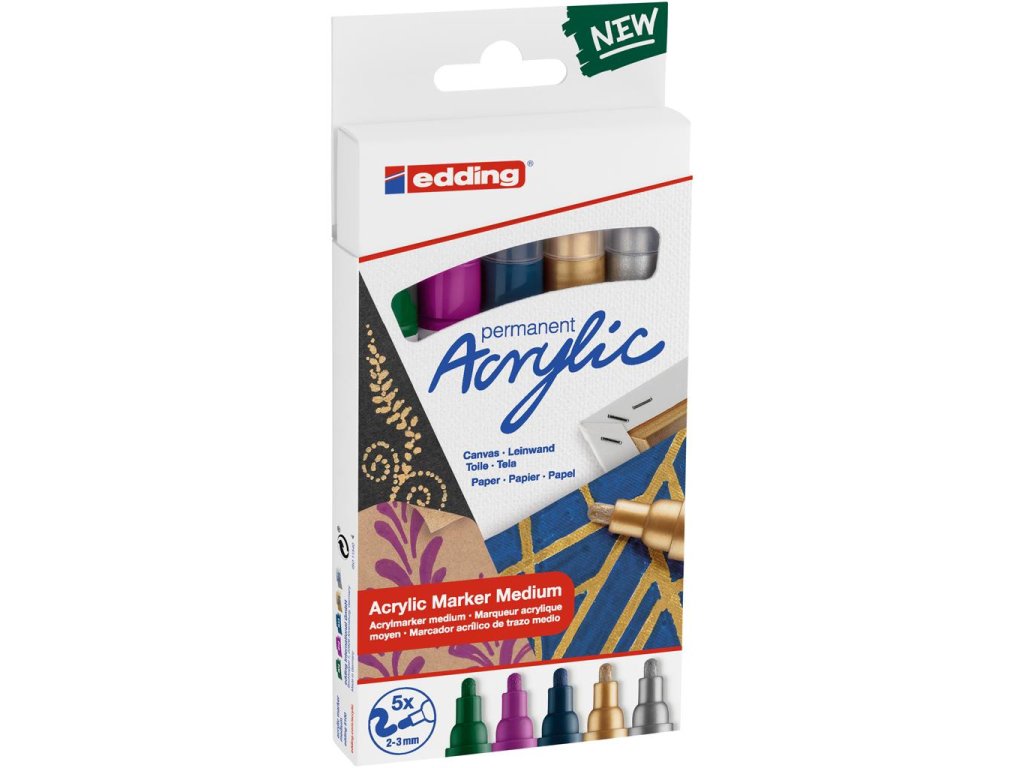 Akrylový popisovač na maľovanie na svetlé alebo tmavé povrchy, ideálny na materiály ako plátno alebo maliarsky papier. Šírka stopy okrúhleho hrotu je 2-3 mm. Vysoko kvalitná pigmentovaná akrylová farba na báze vody je po zaschnutí permanentná, nepriehľadná, svetlostála a bez zápachu. Súprava obsahuje machovozelenú, purpurovú, elegantnú nočnú modrú, zlatú a striebornú farbu. Dodávaný v kvalitnom, znovu použiteľnom puzdre. Vhodné náhradné hroty (edding 5100 náhradné hroty) sú dostupné. Farba sviatočný mix.