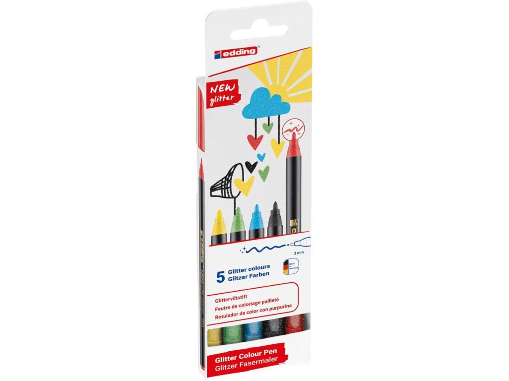 Farebný popisovač s atraktívnym trblietavým atramentom na písanie, dekorovanie, vyfarbovanie, kreslenie a rozvrhovanie na svetlom papieri. Šírka stopy okrúhleho hrotu je 3 mm. Atrament na vodnej báze vo filtračnom systéme je rýchloschnúci a má slabý zápach. Sada obsahuje farby žltý gliter, červený gliter, azúrovo modrý gliter, svetlozelený gliter a čierny gliter.Dodatočné parametre