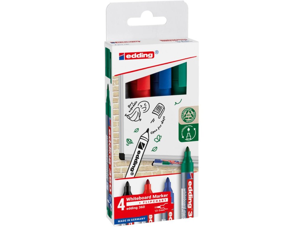 Popisovač vhodný na biele tabule, stierateľný za sucha. Plnený pigmentovým atramentom slabého zápachu bez prísady butylacetátu s vlastnosťou „Cap off“, zabraňujúcou vysychaniu atramentu pri otvorenom hrote aj niekoľko dní. Dopĺňateľný atramentom edding BTK 25. Plastové telo, vymeniteľný hrot. Hrot okrúhly, šírka stopy 1,5---3 mm. Sada 4 ks v mixe farieb.Farba: sada 4 farieb