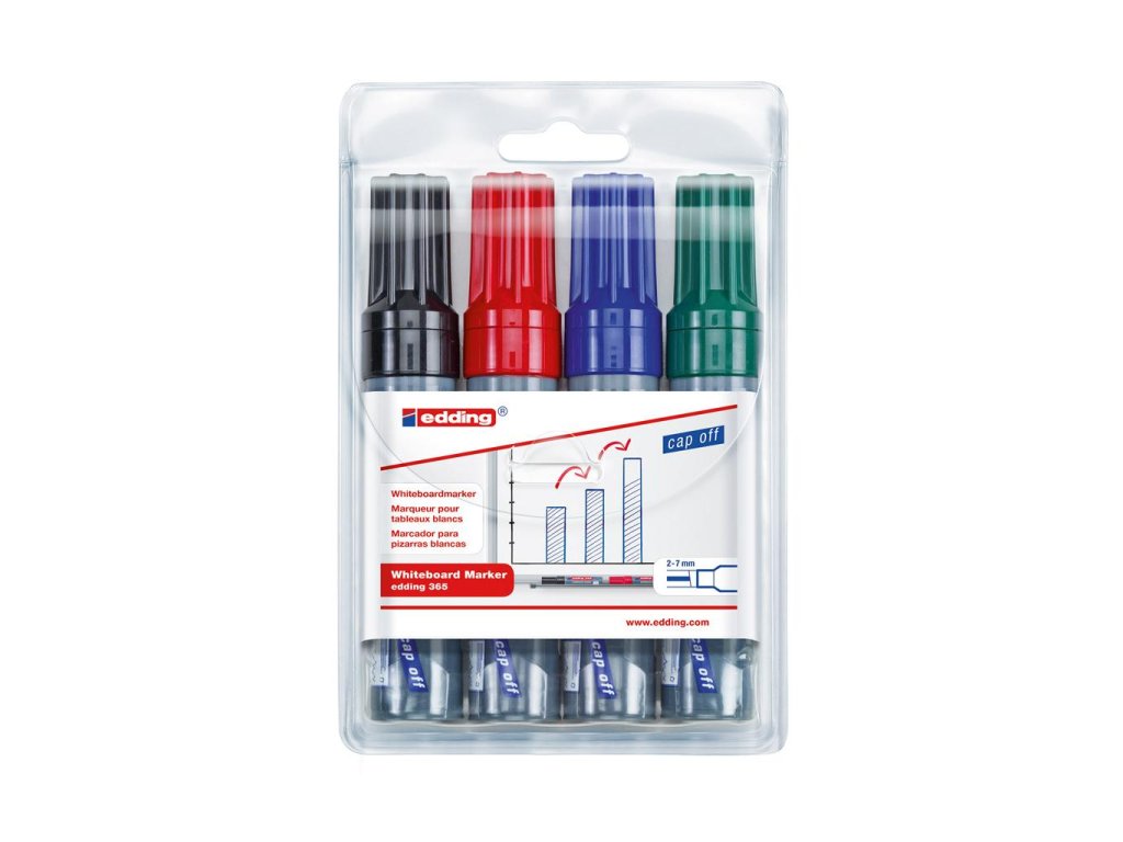 Popisovač s plastovým telom a vymeniteľným hrotom. Dopĺňateľný atramentom edding BT 30. Hrot zrezaný, šírka stopy 2---7 mm. Dodávaný v sade 4 ks.Farba: sada 4 farieb