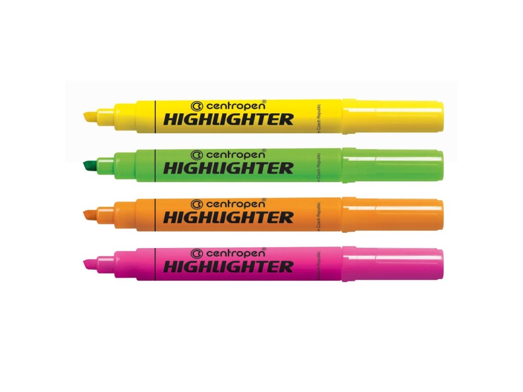 Zvýrazňovač s celofluorescenčným plášťom. Reflexný pigmentový atrament s vysokým stupňom flourescencie a odolnosti proti UV žiareniu. Pre zvýrazňovanie textov na všetkých druhoch papiera. Klinový hrot, šírka stopy 1 - 4,6 mm.Dodatočné parametre