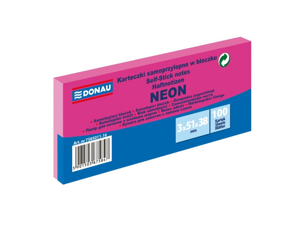 Univerzálne neónové samolepiace bločky z papiera gramáže 70 g / m², 100-lístkové, jednotlivo balené. Lepidlo nanesené po dlhšej strane, zmývateľné vodou. Udelený Green Point. 3 bločky vo fólii s červeným pruhom na uľahčenie otvárania. Väčšie balenie 36 ks. Farba neónovo ružová.Dodatočné parametre