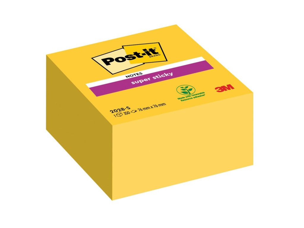 Post‑it® Super Sticky kocka so špeciálnym lepidlom, vďaka ktorému držia lístky aj na nerovnom povrchu. V balení 350 lístkov rozmerov 76 × 76 mm. Farba ultra žltá.- Post-it® Poznámkové bloky Super Sticky sa vyznačujú výnimočne silným lepidlom.
