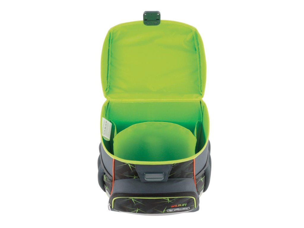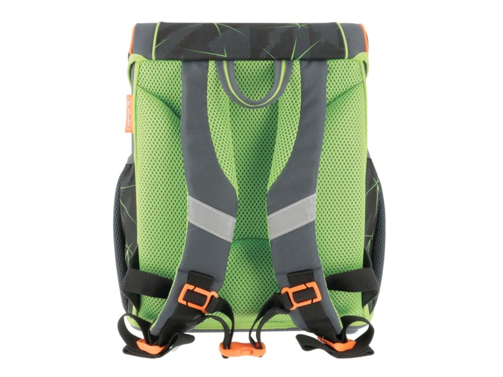 Školská taška s výbavou, ergonomicky tvarovaným a priedušným polstrovaním chrbta, nastaviteľnými ramennými popruhmi, výškovo nastaviteľným hrudným pásom, hlavným vreckom s priestorom na knihy, bočnými vreckami s elastickými pásikmi, predným vreckom na zips, stabilnou spodnou doskou s nožičkami, pohodlnou rukoväťou a reflexnými prvkami Oralite. Hmotnosť 950 g, objem 16 l, rozmery 37 x 31 x 22 cm. Vode-odolná, bez PVC, výbava: peračník, vrecko na prezuvky, okrúhle puzdro. Certifikát ergonómie 2023 a 2025. Materiál: polyester.Dodatočné parametre