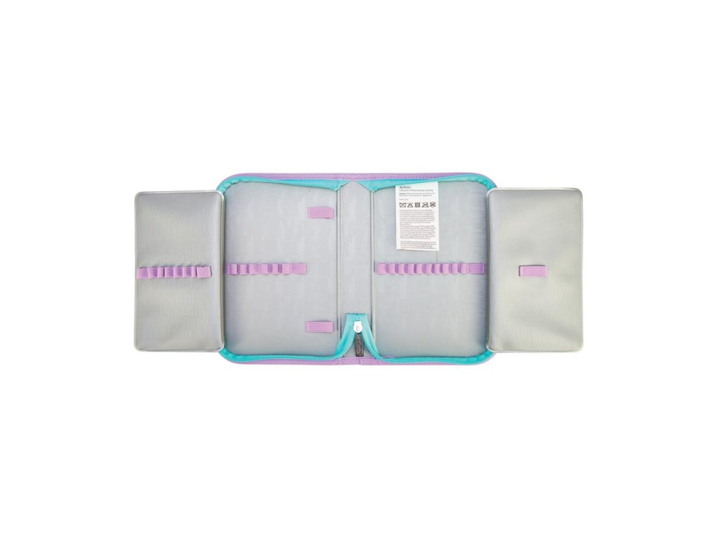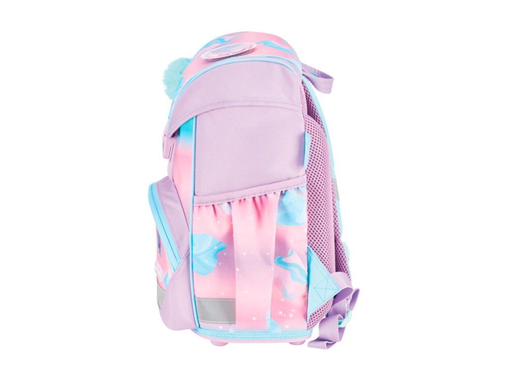 Školská taška s výbavou, s anatomicky tvarovaným polstrovaným a priedušným chrbtom, nastaviteľnými ramennými popruhmi, predným vreckom na zips, dvomi bočnými vreckami s elastickými pásikmi, stabilnou spodná doskou s nožičkami, pohodlnou rukoväťou, reflexnými prvkami Oralite, zatváranie Click lock zips, 1 x odnímateľný odznačik na suchý zips, 1 x dekoratívny prvok. Hmotnosť 800 g, objem 22 l, rozmery: 39 x 32 x 25 cm. Vode-odolná, bez PVC, výbava: peračník prázdny 2 chlopne, vrecko na prezuvky, oválne puzdro.Dodatočné parametre