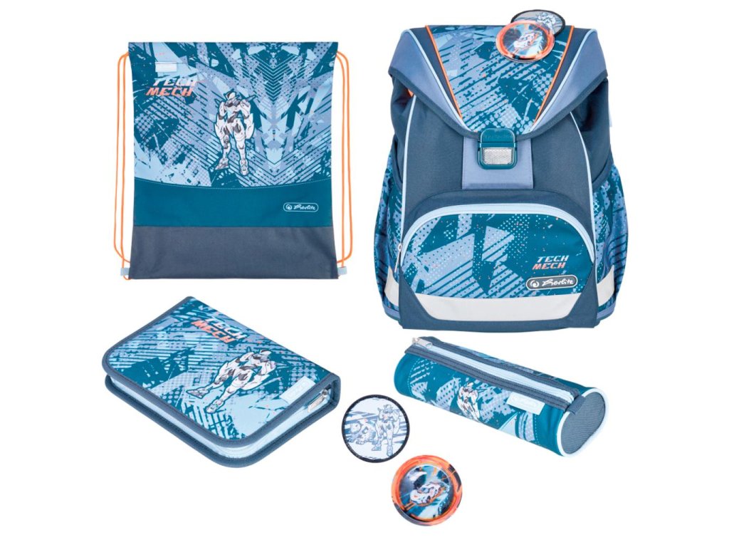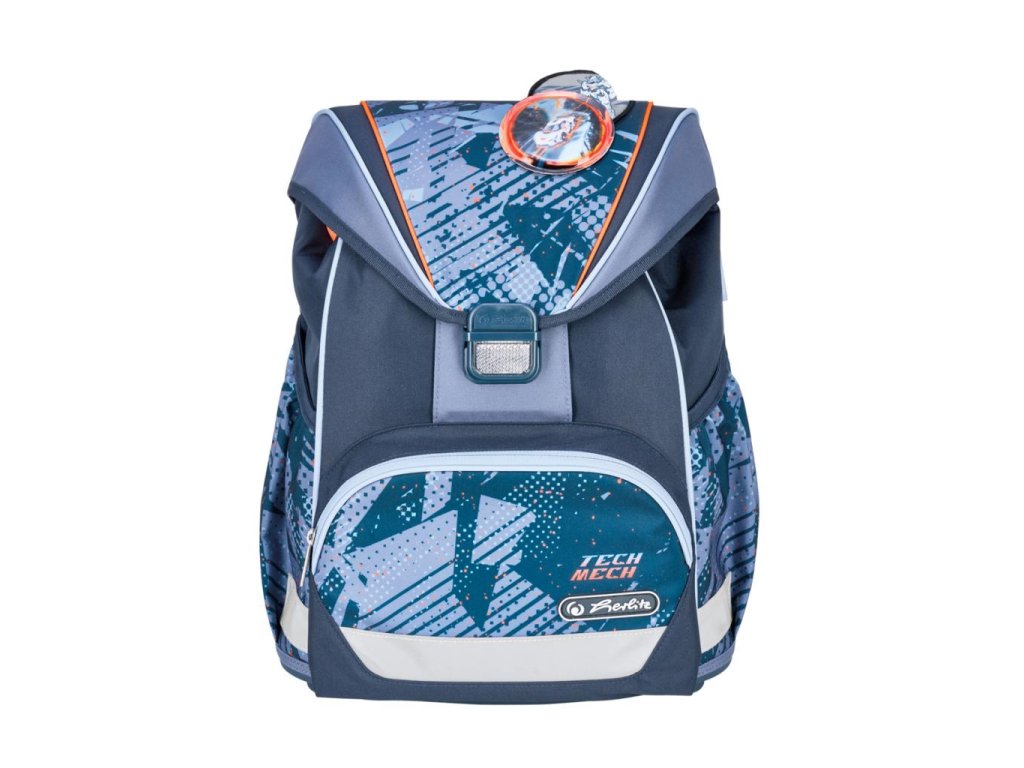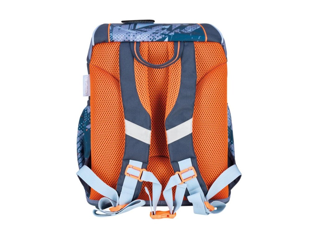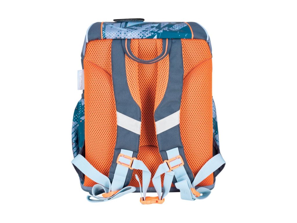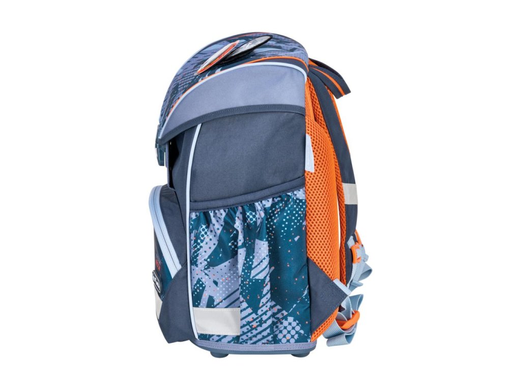 Školská taška s výbavou, s anatomicky tvarovaným polstrovaným a priedušným chrbtom, nastaviteľnými ramennými popruhmi, predným vreckom na zips, dvomi bočnými vreckami s elastickými pásikmi, stabilnou spodná doskou s nožičkami, pohodlnou rukoväťou, reflexnými prvkami Oralite, zatváranie Click lock zips, 1 x odnímateľný odznačik na suchý zips, 1 x dekoratívny prvok. Hmotnosť 800 g, objem 22 l, rozmery: 39 x 32 x 25 cm. Vode-odolná, bez PVC, výbava: peračník prázdny 2 chlopne, vrecko na prezuvky, oválne puzdro.Dodatočné parametre
