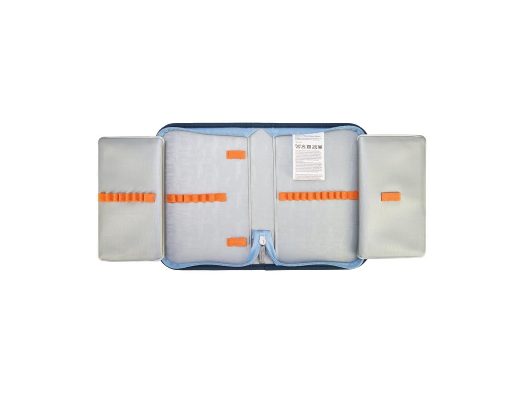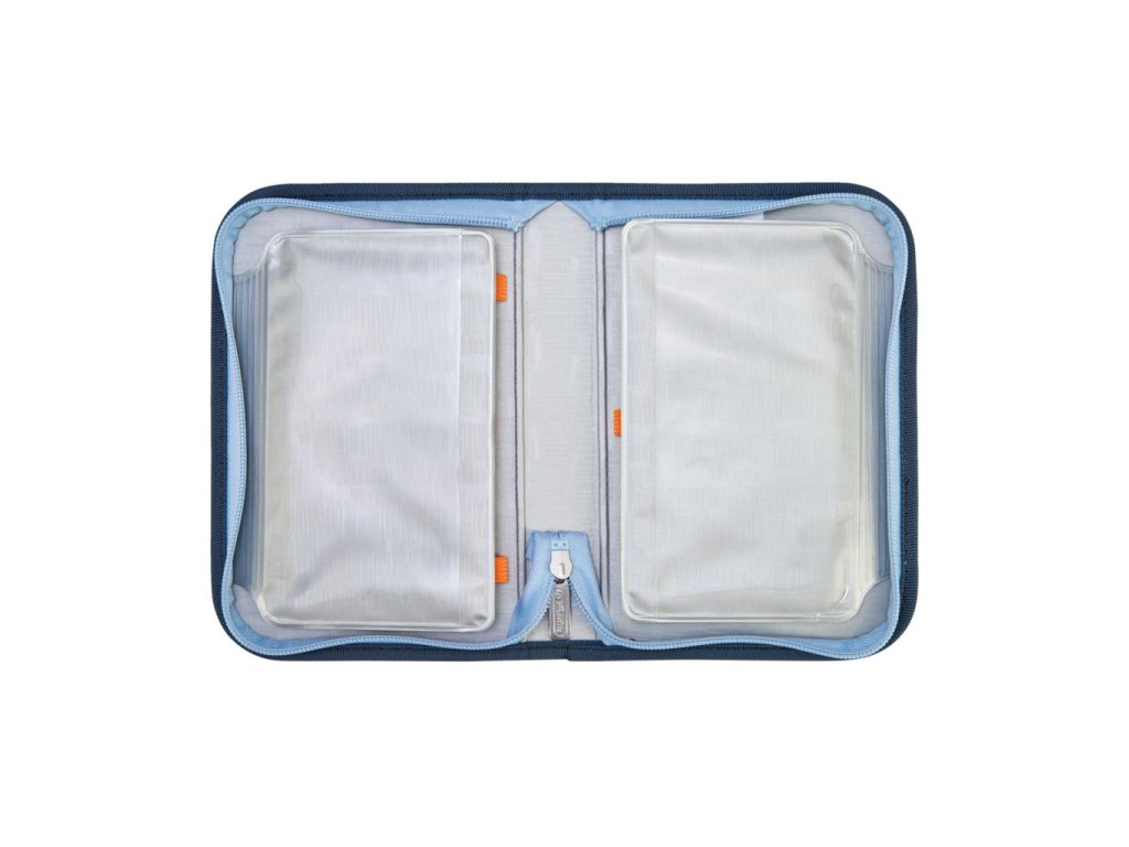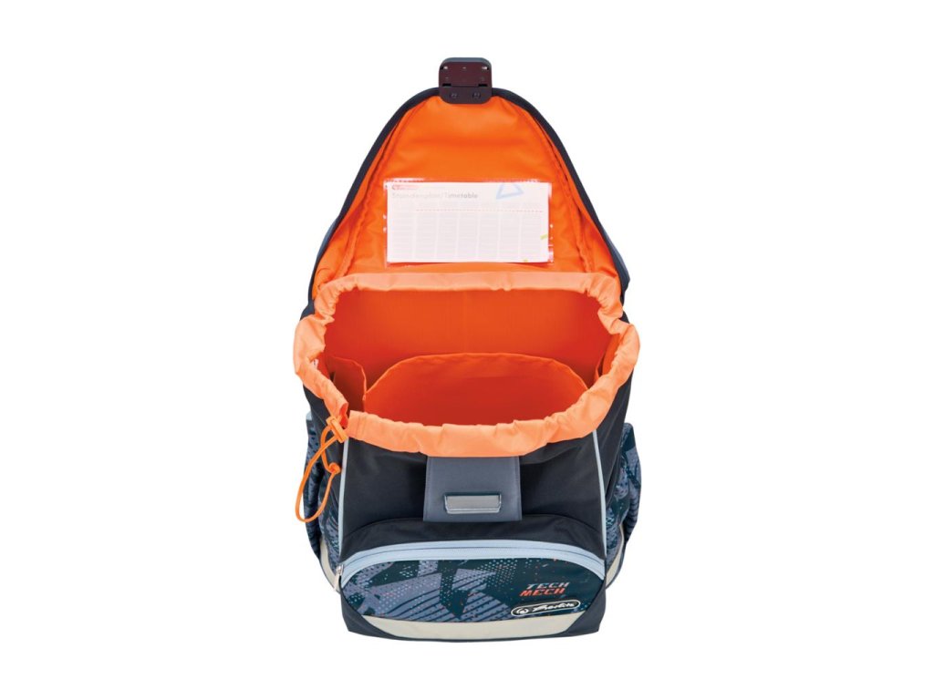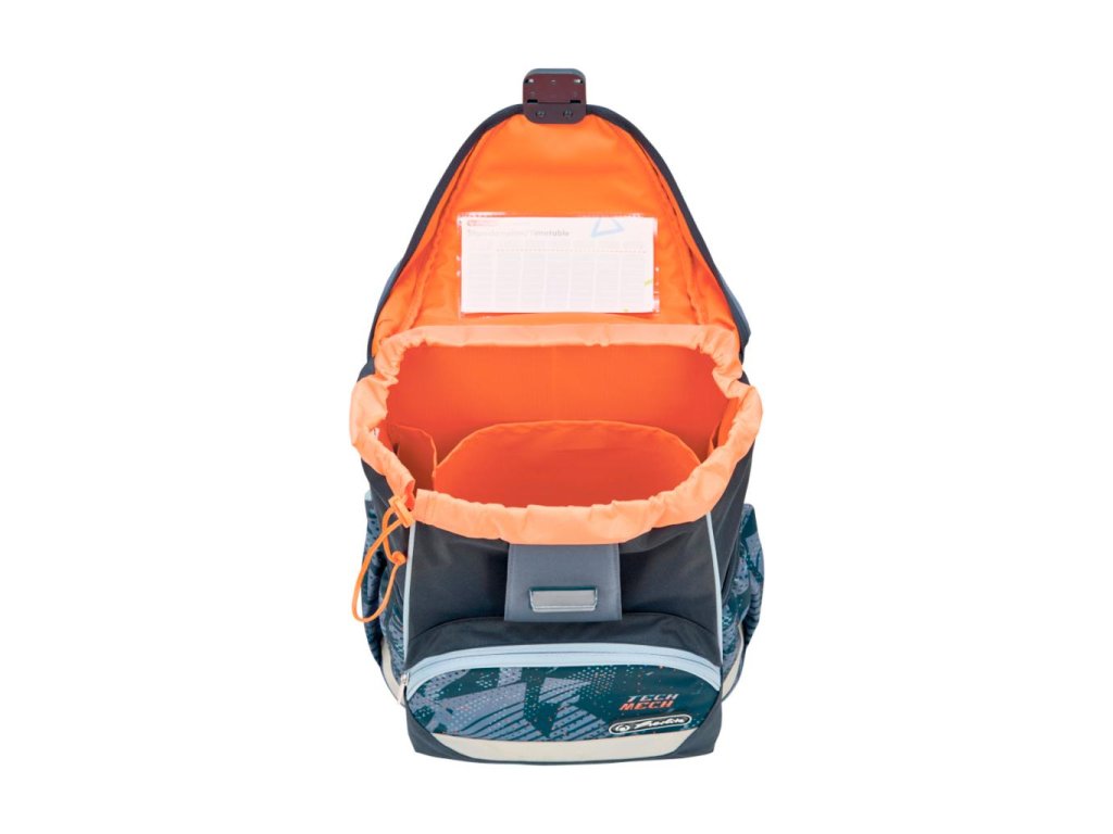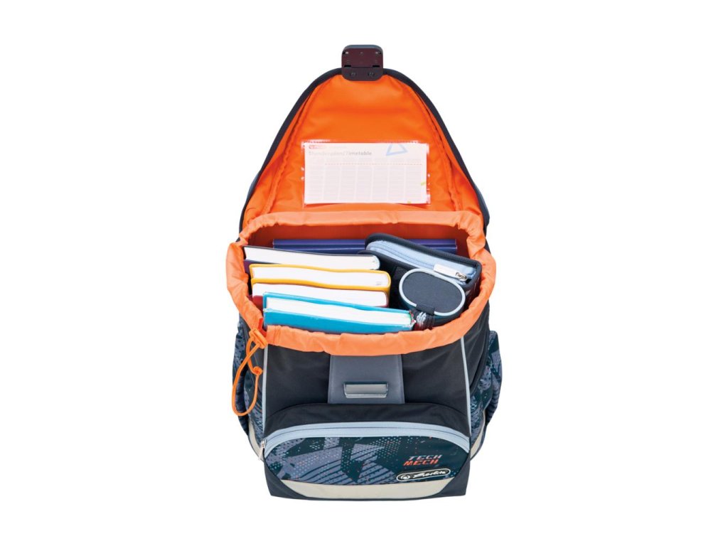 Školská taška s výbavou, s anatomicky tvarovaným polstrovaným a priedušným chrbtom, nastaviteľnými ramennými popruhmi, predným vreckom na zips, dvomi bočnými vreckami s elastickými pásikmi, stabilnou spodná doskou s nožičkami, pohodlnou rukoväťou, reflexnými prvkami Oralite, zatváranie Click lock zips, 1 x odnímateľný odznačik na suchý zips, 1 x dekoratívny prvok. Hmotnosť 800 g, objem 22 l, rozmery: 39 x 32 x 25 cm. Vode-odolná, bez PVC, výbava: peračník prázdny 2 chlopne, vrecko na prezuvky, oválne puzdro.Dodatočné parametre