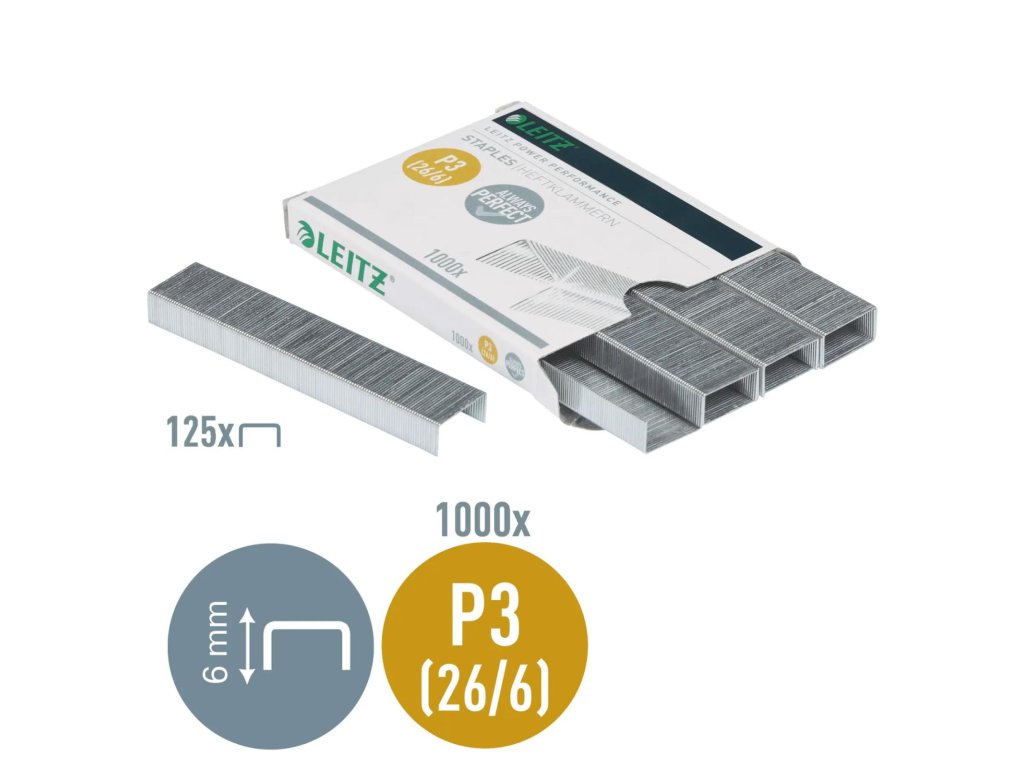 Spinky Leitz Power Performance P3. Kvalitné oceľové spinky 26/6. K zošitiu až 30 listov (80 g/m2). Dĺžka nožičky spinky 6 mm. Krabička obsahuje 1000 spiniek.Najoptimálnejší výkon pri použití v Leitz zošívačkách. Prémiová kvalita, odporúčané aj do všetkých značkových zošívačiek.