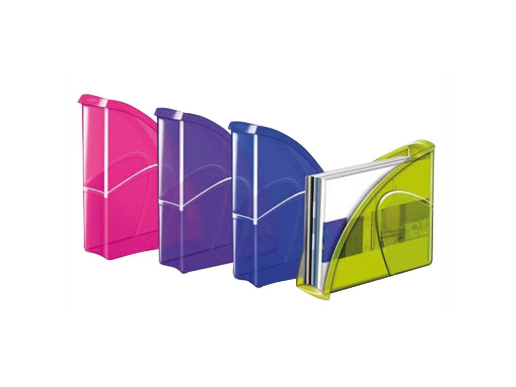 Stojan na časopisy s možnosťou vertikálneho alebo horizontálneho postavenia má elegantné línie, zvýraznené materiálom s kontrastným matným povrchom na hladkom pozadí. Vhodný na dokumenty do veľkosti 24 × 32 cm. Kapacita 700 listov (80 g / m²), rozmery 270 × 85 × 310 mm. Materiál 100% recyklovateľný vysokokvalitný plast. Väčšie balenie 10 ks. Farba transparentná fialová.Dodatočné parametre