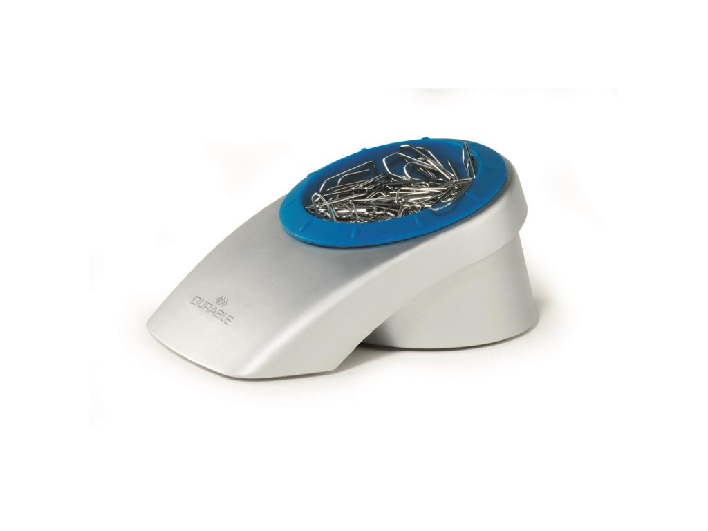 Štýlový stojan na kancelárske spony v dizajne produktovej rady DURABLE VEGAS dodávaný so 100 sponami. Veľký magnetizovaný priestor na spinky umožňuje ich ľahké vyberanie. Protišmyková úprava. Kapacita 100 spôn veľkosti 32 mm. Rozmery (š×v×d) 92×63×144 mm.Farba: strieborná/modrá