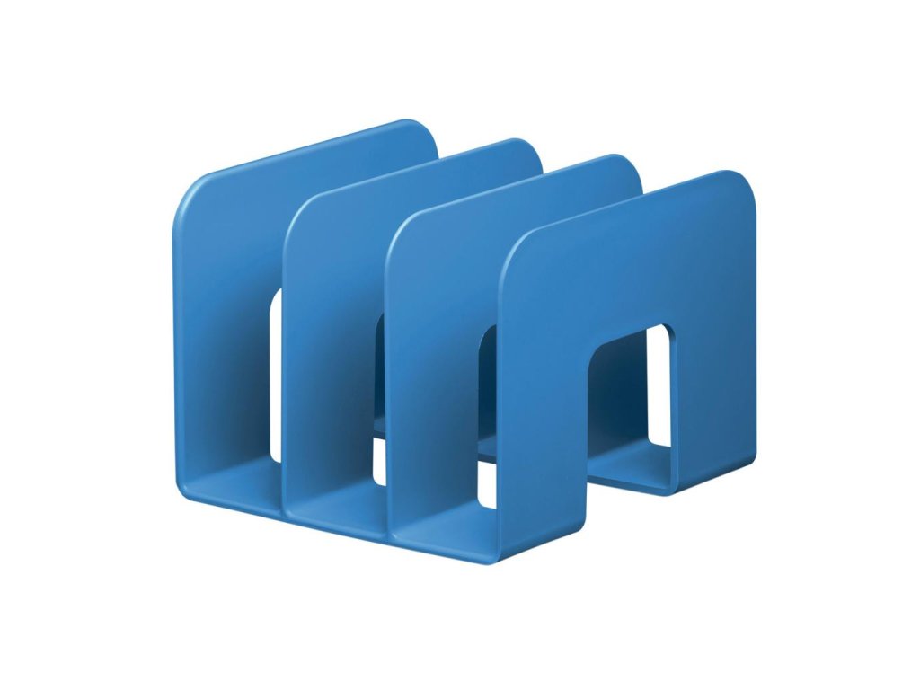 Trojpriehradkový stojan na katalógy pre flexibilné použitie. Vyrobený z recyklovaných plastov v kvalite Blue Angel. Priehradky široké 65 mm. Jednoduché zasúvanie a vyberanie. Vhodný pre časopisy, brožúry, katalógy atď. Rozmery: 215 x 165 x 210 mm (Š x V x H). Farba modrá.Dodatočné parametre