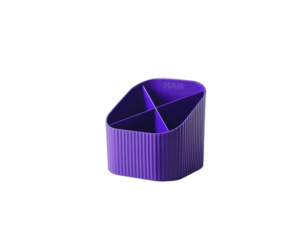 Stojan so 4 priehradkami v modernom dizajne a trendových farbách. Materiál vysokokvalitný PP. Rozmery 111 × 121 × 106 mm. Farba fialová.Dodatočné parametre