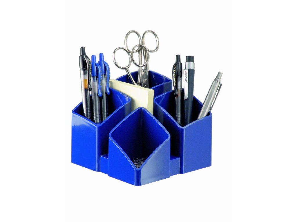Stojan so 4 sekciami na písacie potreby a ďalšie kancelárske drobnosti. Spodná strana s protišmykovou úpravou. Materiál kvalitný plast vysokého lesku. Pri spojení 2 alebo 4 stojanov dosiahnete zaujímový moderný efekt. Rozmery 125 × 125 × 100 mm. Stojan dodávaný prázdny.Farba: modrá