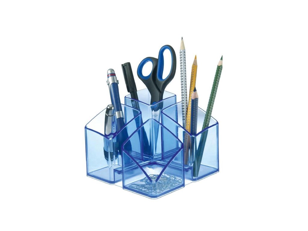 Stojan so 4 sekciami na písacie potreby a ďalšie kancelárske drobnosti. Spodná strana s protišmykovou úpravou. Materiál kvalitný plast vysokého lesku. Pri spojení 2 alebo 4 stojanov dosiahnete zaujímový moderný efekt. Rozmery 125 × 125 × 100 mm. Stojan dodávaný prázdny.Farba: priehľadná modrá