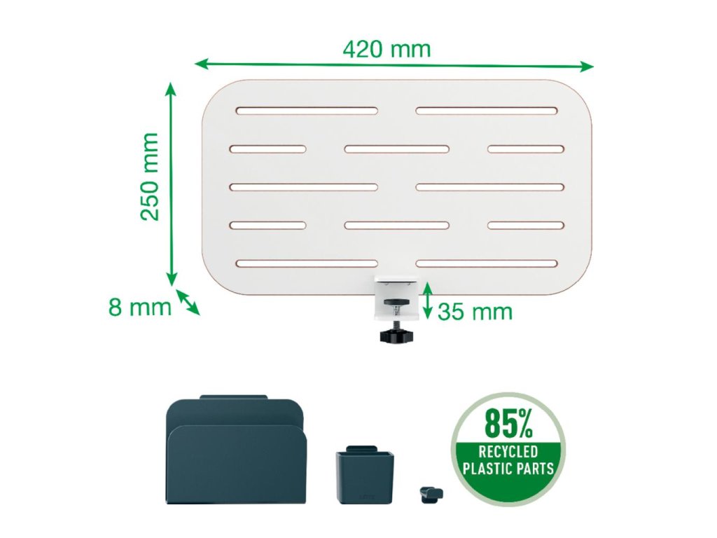 Dierkovaná doskaDoplnky vyrobené z 85 % z recyklovaného plastu: A4/ držiak na poznámkový blok, držiak na pero a háčik