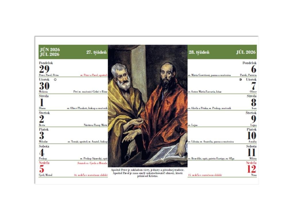 Stolový dvojtýždenný kalendár, slovenské kalendárium s obrazmi od slávnych i neznámych autorov s náboženskou tematikou doplnené biblickými textami. Obsahuje prehľad cirkevných sviatkov, štátnych sviatok, dní pracovného pokoja a pamätných dní.dvojtýždenný stolový kalendár