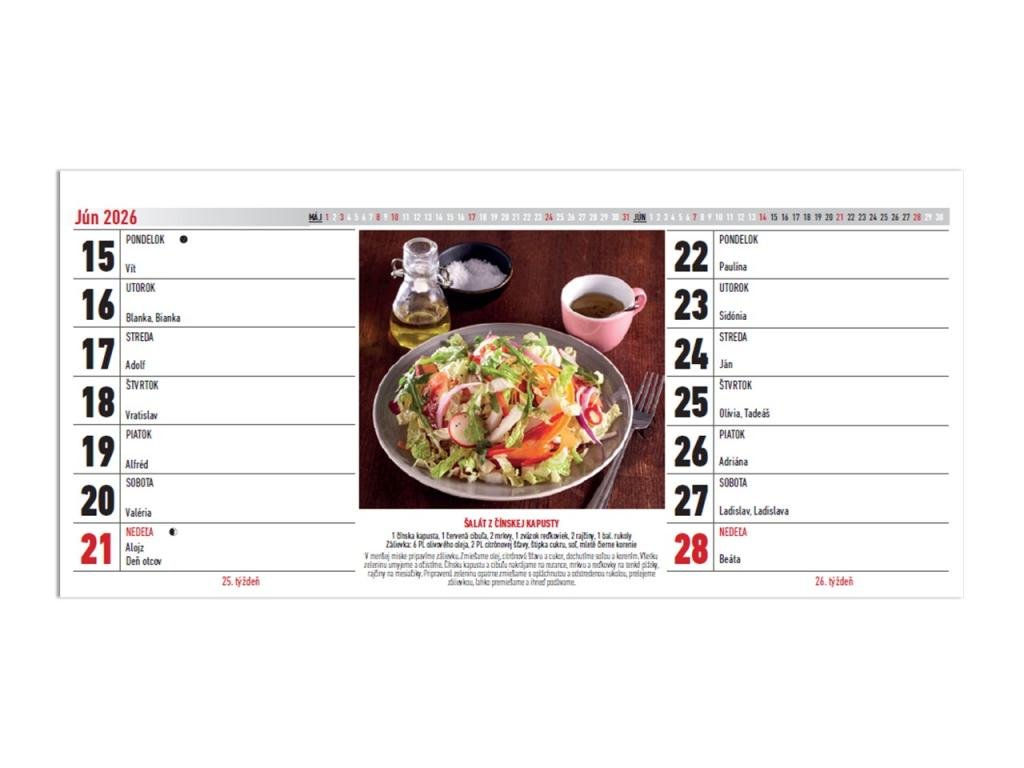 Stolový kalendár, slovenské kalendárium s obrázkami a receptami jedál, doplnený o abecedný zoznam receptov, prehľadný mesačný kalendár, prehľadný kalendár 2024 a fázy Mesiaca.dvojtýždenný stolový kalendár