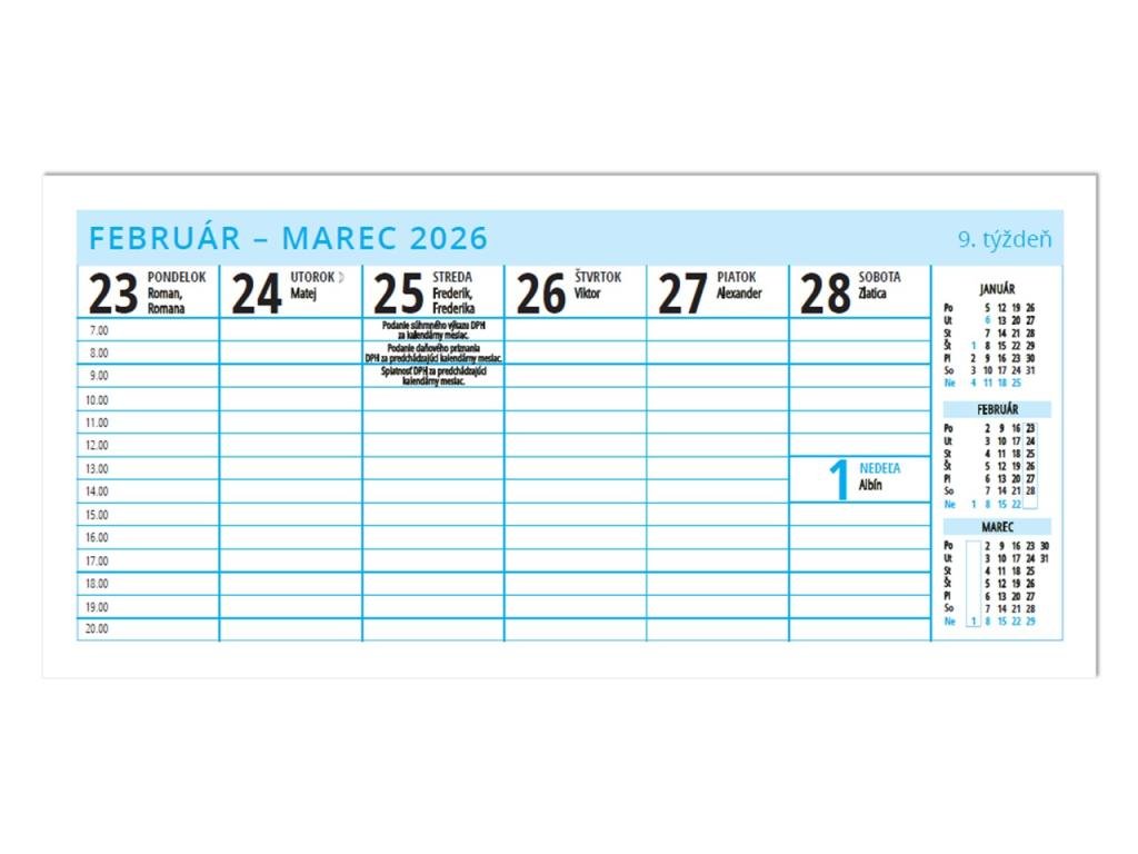 Obsahuje týždňové stĺpcové kalendárium, slovenské kalendárium s hodinovým delením od 7.00 do 20.00, mesačné kalendária, daňové pripomienky a daňový kalendár, fond pracovného času, fázy Mesiaca, štátne sviatky, dní pracovného pokoja, pamätné dni a prehľadný kalendár 2026.týždenný stolový kalendár, hodinové delenie