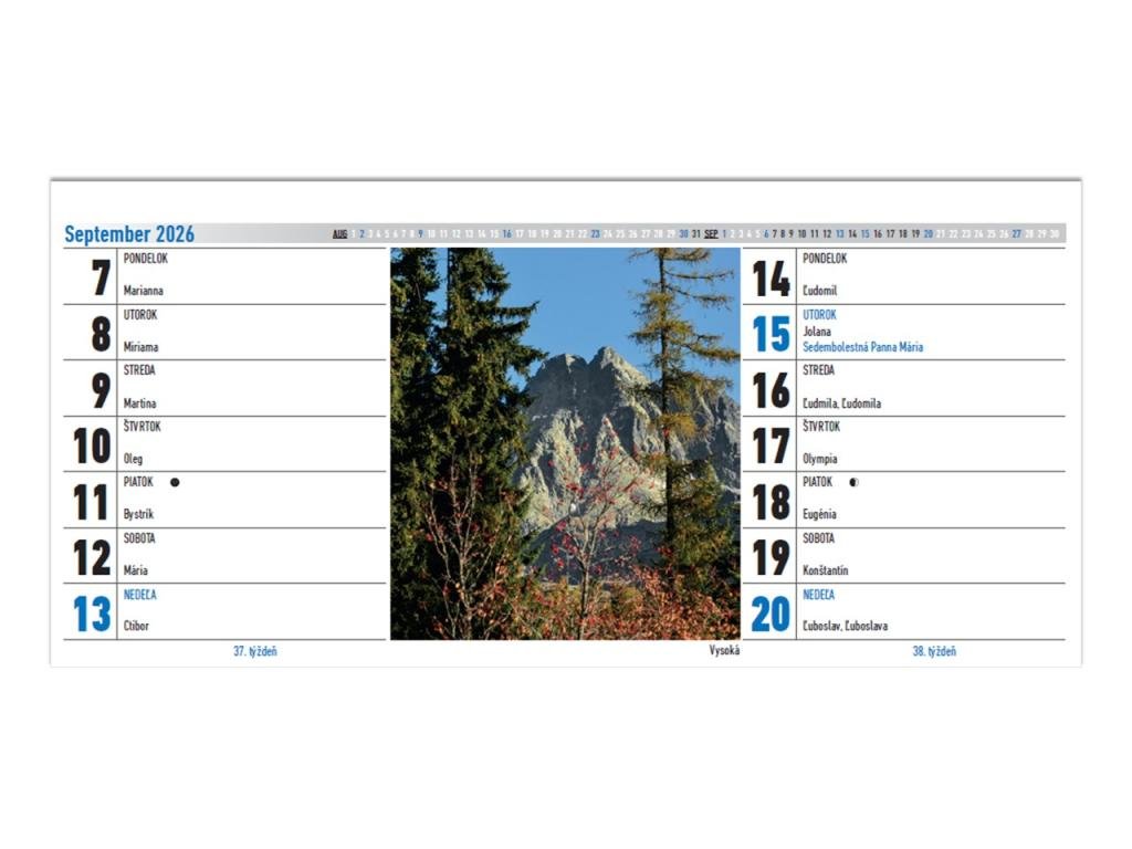 Obsahuje riadkové slovenské kalendárium, fázy Mesiaca, prehľadný mesačný kalendár, prehľadný kalendár 2026 a 2027.dvojtýždenný stolový kalendár