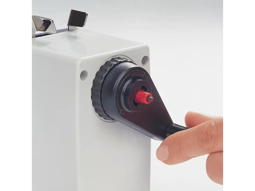 Značkové mechanické strúhadlo s vysokokvalitnými oceľovými nožmi a nastaviteľným tvarom hrotu, z plastu, na tuhy a ceruzky priemeru do 12 mm v atraktívnom dizajne s automatickým prichytením ceruzky pri strúhaní a jej automatickým uvoľnením po zastrúhaní.Kovová objímka prítlaku zabezpečuje dlhú životnosť.