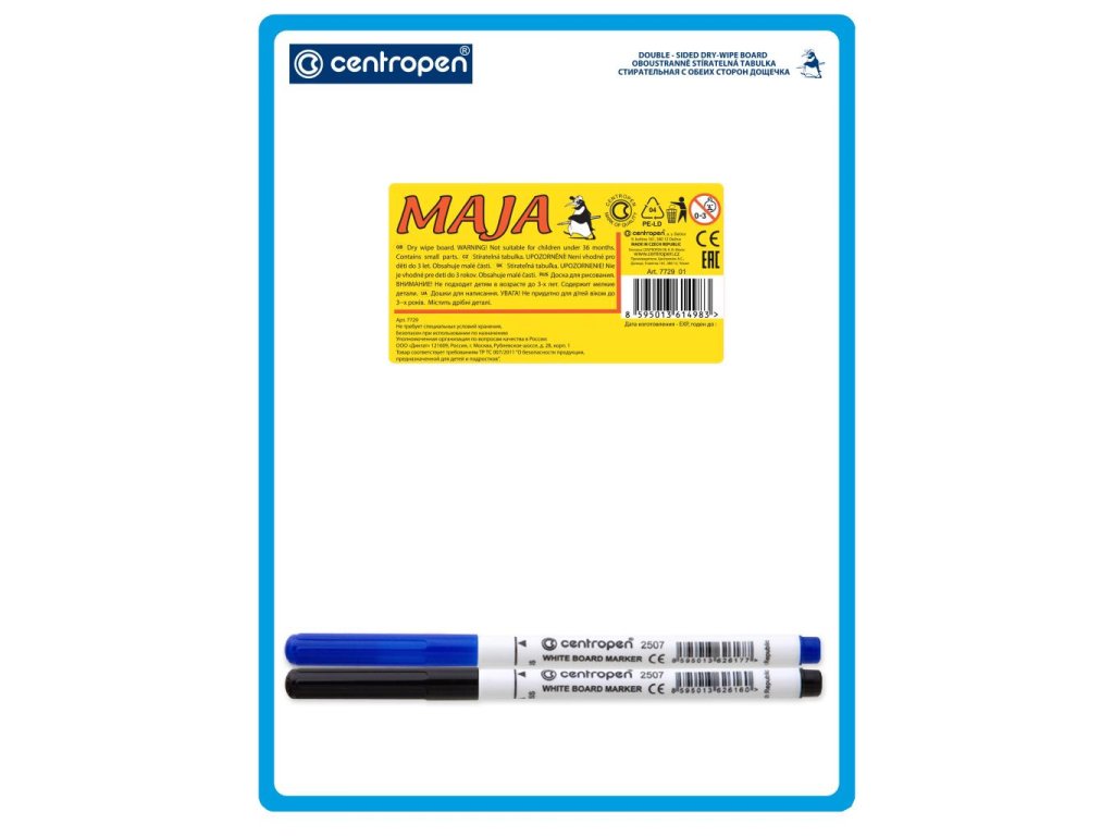 Obojstranne stierateľná tabuľka CENTROPEN 18 x 24 cm s vytlačenými linkami. Vhodná na nácvik písania a kreslenia. Obsahuje 2 značkovače centropen 2507, čierny a modrý.Kartónové balenie: 20 ks