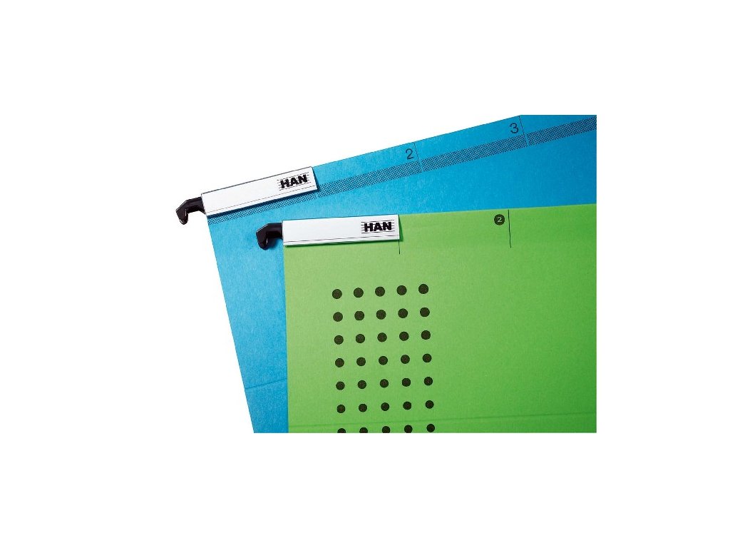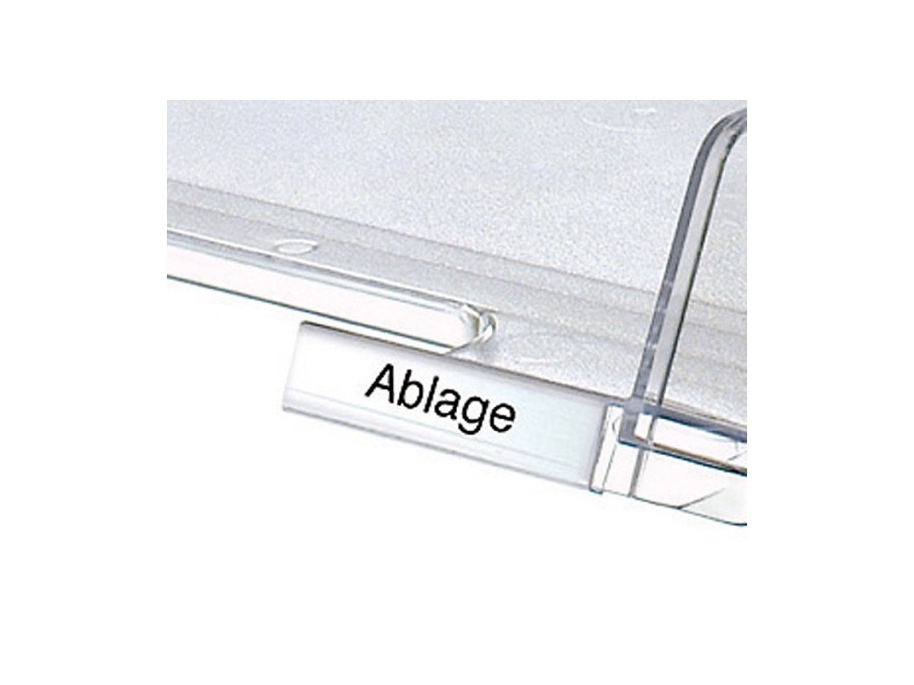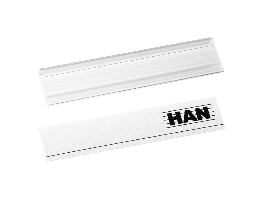 Balenie 10 ks priehľadných čírych klipov z plastu a 10 papierových etikiet na označovanie odkladačov a zásuvkových boxov značky HAN a závesných obalov.Farba: priehľadná číra