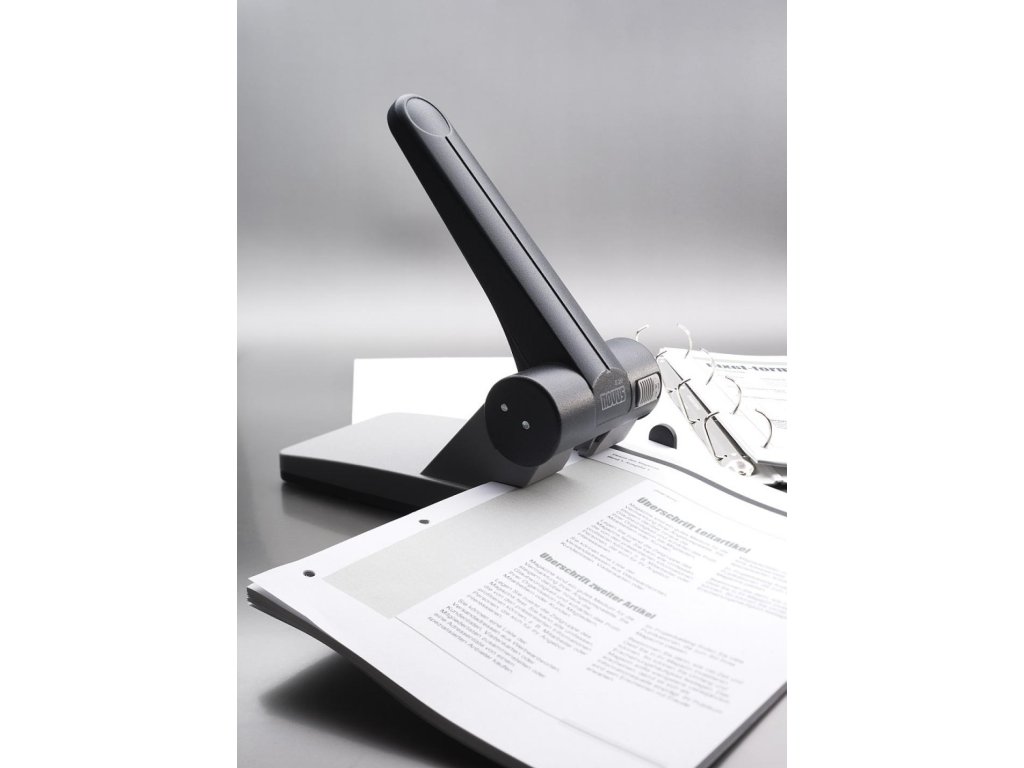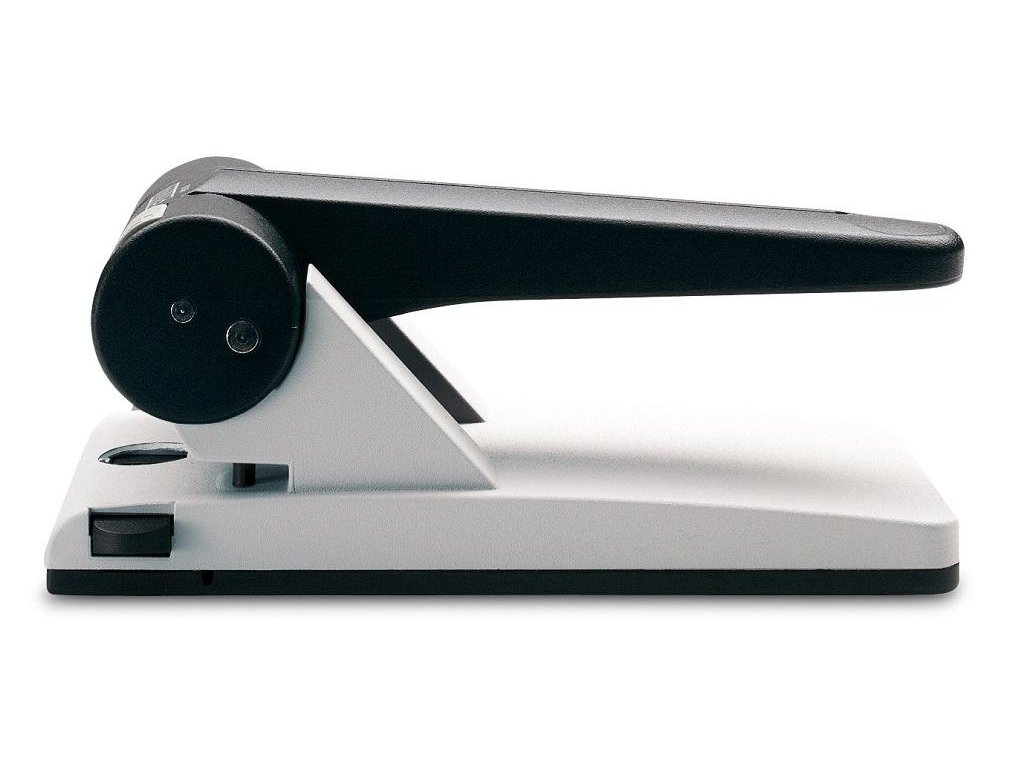 Veľkokapacitná dierovačka s posuvným pravítkom a aretáciou horného dielu pre ľahké uloženie a pákovým prevodom pre optimálny dierovací výkon. Rozpätie dier 8 cm. Hmotnosť 1250 g. Záruka 10 rokov.Farba: sivá/čierna