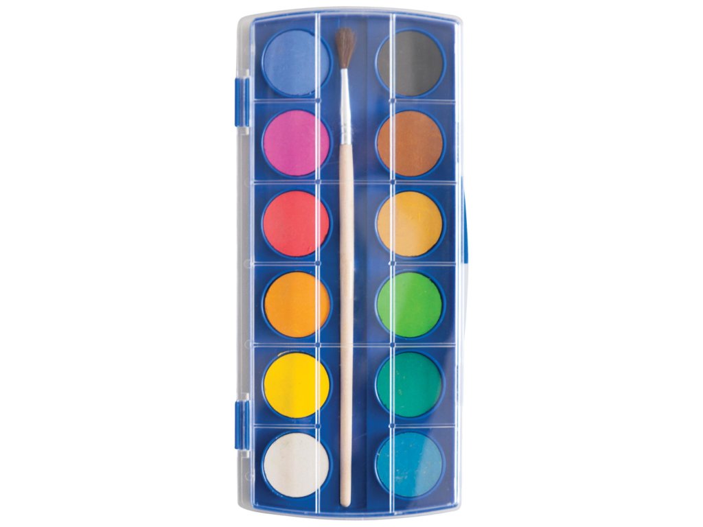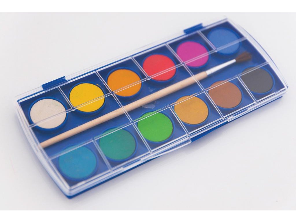 Školské akvarelové farby, v plastovej krabici, veľmi užitočné pri umeleckom vzdelávaní detí. Štetec v balení. 12 farieb.Dodatočné parametre