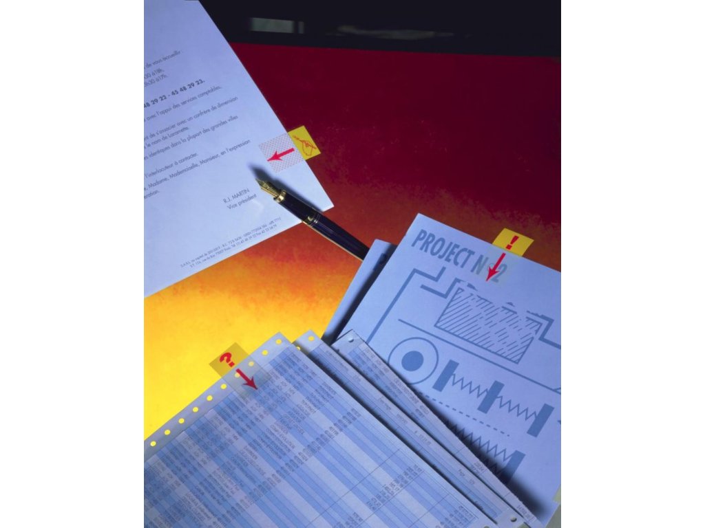 Široké acetátové záložky s obrázkom výkričníka slúžia nielen pre sekretárky na označenie miesta, ktoré má byť podpísané.Priehľadná lepiaca časť a farebná časť na označenie. Prelepiteľné, znovunalepiteľné a popisovateľné. Rozmery záložky 25,4 × 43,2 mm. Farba žltá. Počet lístkov: 50.
