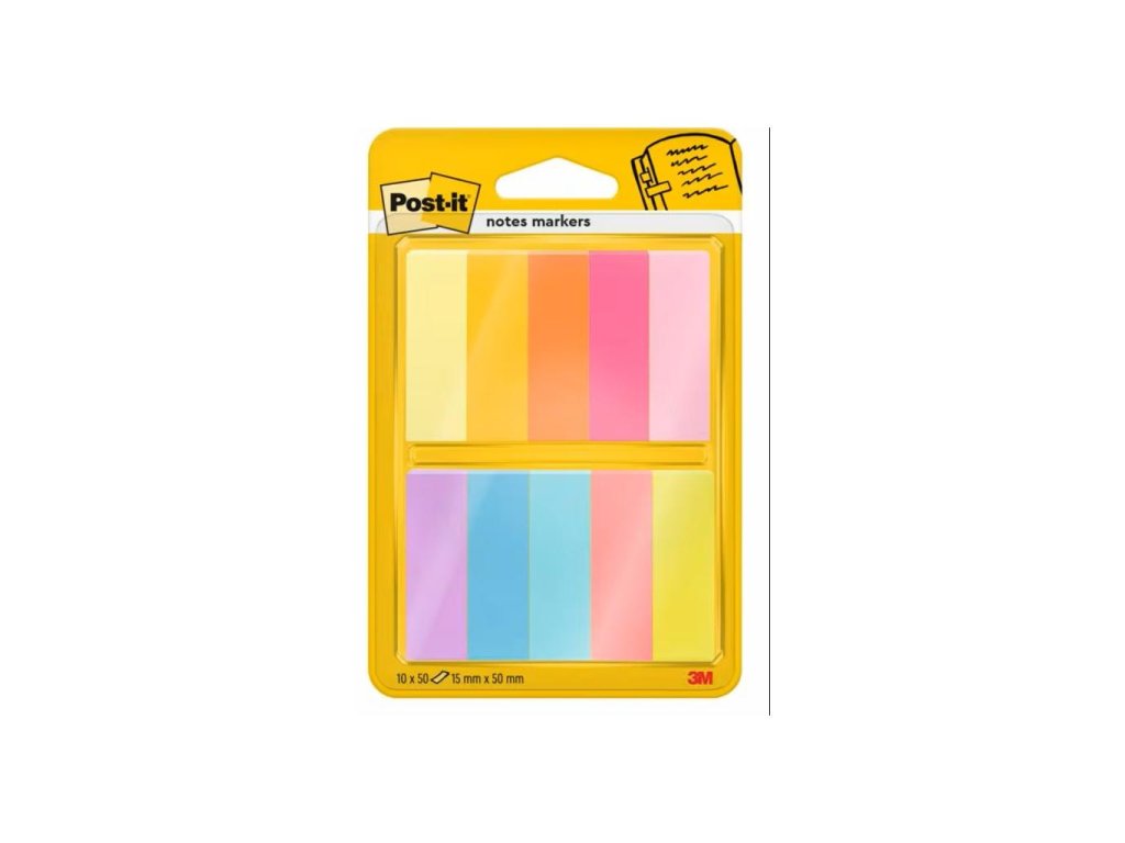 Viacnásobne prelepiteľné papierové záložky Post‑it®. Ideálne na označovanie strán. Po odlepení nezanechávajú zvyšky lepidla. Rozmery 12,7 × 44,4 mm. V balení 10 farieb po 50 lístkov.- Post-it® označovacie štítky v rôznych farbách.