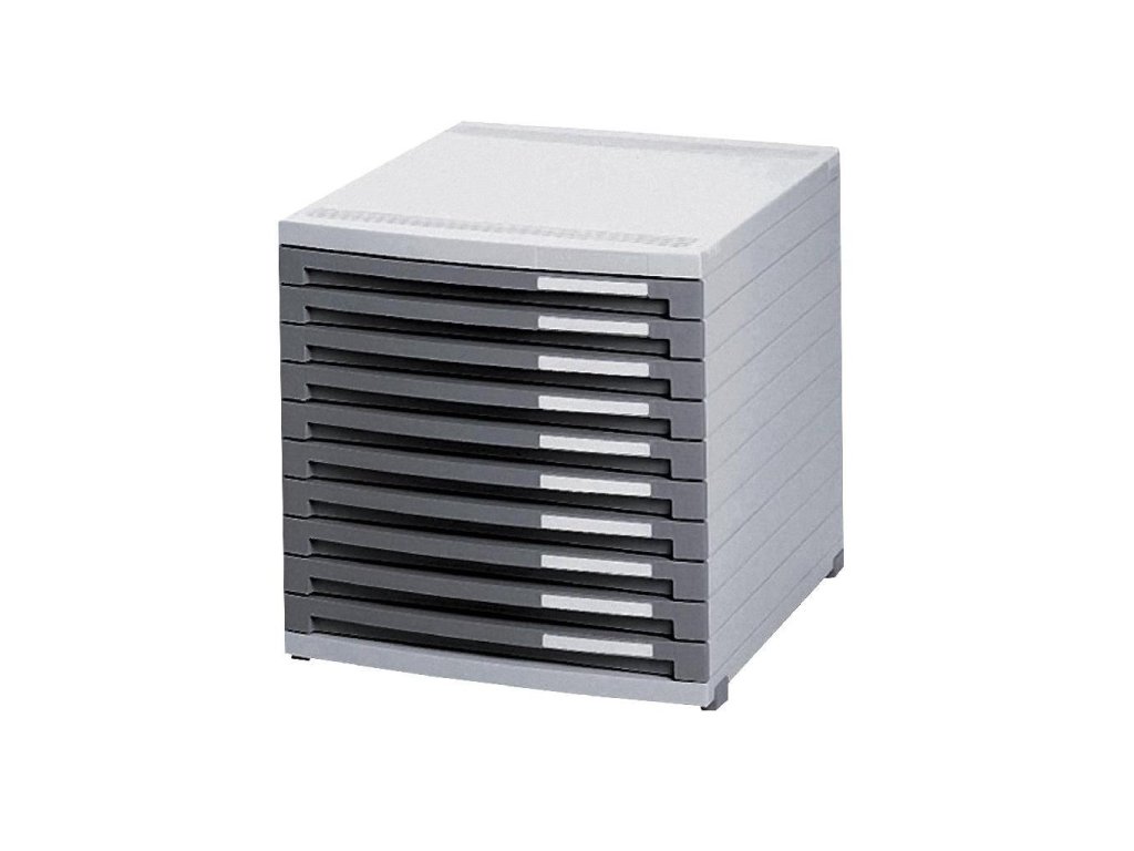 Box z modulárneho systému zásuvkových boxov s horizontálnym aj vertikálnym spájaním. Model s otvorenými zásuvkami (bez predného krytu) výšky 25 mm a zarážkou chrániacou zásuvky pred úplným vysunutím. Súčasťou sú identifikačné menovky na označenie zásuviek.Telo boxov vo svetlosivej farbe, zásuvky tmavosivé. Rozmery (š × v × h) 30 × 30,7 × 38,2 cm.Výška zásuvky: 2,5 cm