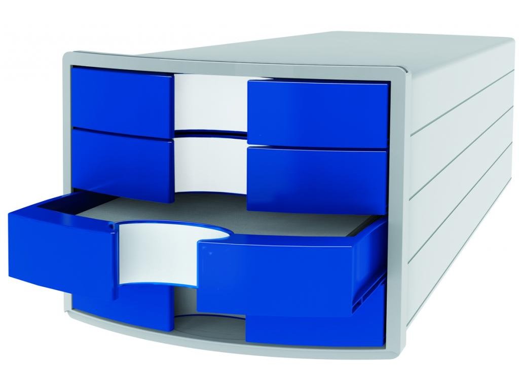 Box so štyrmi zatvorenými zásuvkami v tvare počítačového monitora.Rozmery (š × v × h) 294 × 235 × 368 mm.Farba boxu/zásuvky: sivá/modrá
