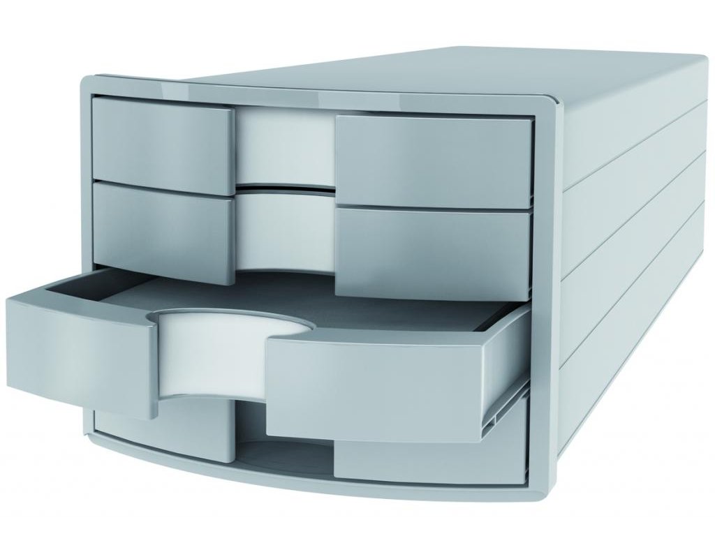 Box so štyrmi zatvorenými zásuvkami v tvare počítačového monitora.Rozmery (š × v × h) 294 × 235 × 368 mm.Farba boxu/zásuvky: sivá/sivá