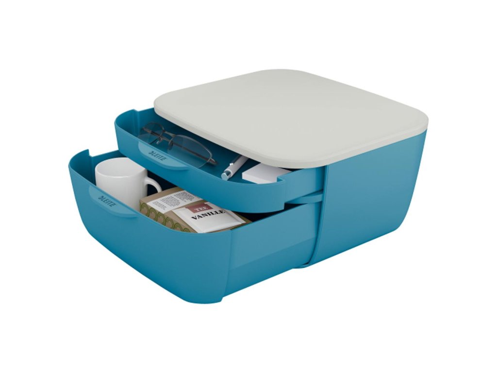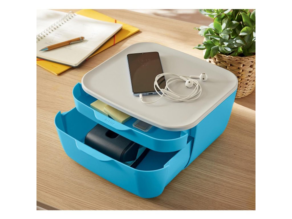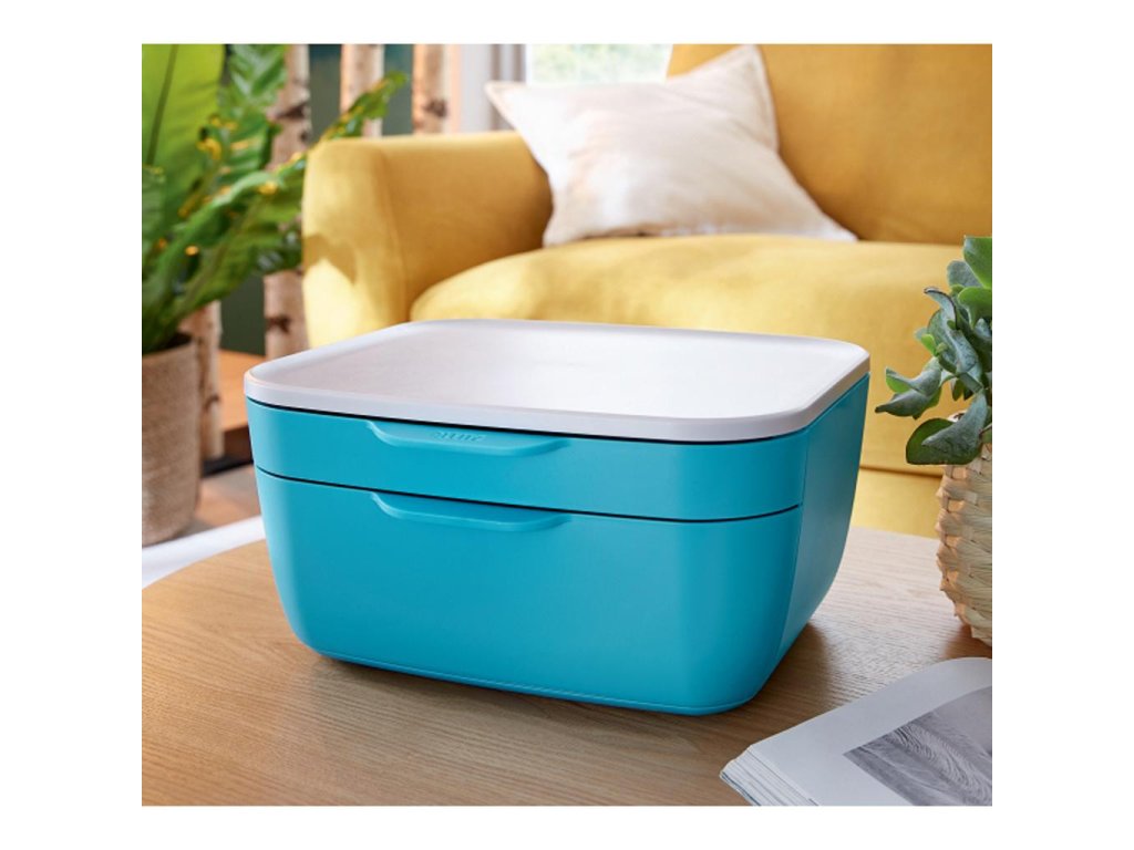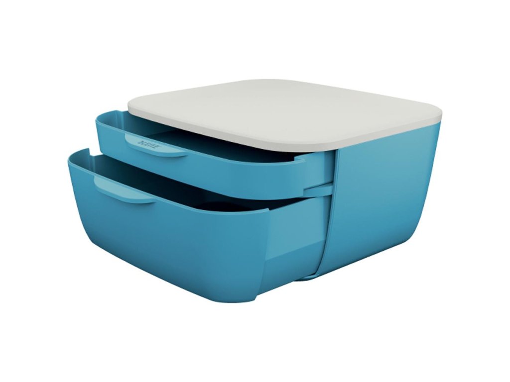 Značková kolekcia Leitz Cosy vám umožní cítiť sa ako doma, nech už vás váš pracovný deň zavedie kamkoľvek. Vďaka minimalistickému dizajnu a lákavej matnej povrchovej úprave pridáte svojmu pracovnému priestoru štýl a farbu. Zásuvkový box Leitz Cosy je ideálny na uloženie všetkých dôležitých vecí, ako sú písacie potreby, bloky a káble. Tento zásuvkový box prvotriednej kvality je perfektný doplnok vášho domova alebo kancelárie, pomôže vám, aby ste nestrácali čas hľadaním drobností a sústredili sa počas dňa na dôležitejšie veci. Zásuvkový box s 2 zásuvkami (1 malá a 1 veľká). Lákavé matné farby s minimalistickým dizajnom. Základňa boxu má veľkosť cca A4. Rozmery 251 x 143 x 275 mm. Farba modrá.Dodatočné parametre