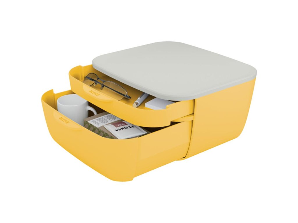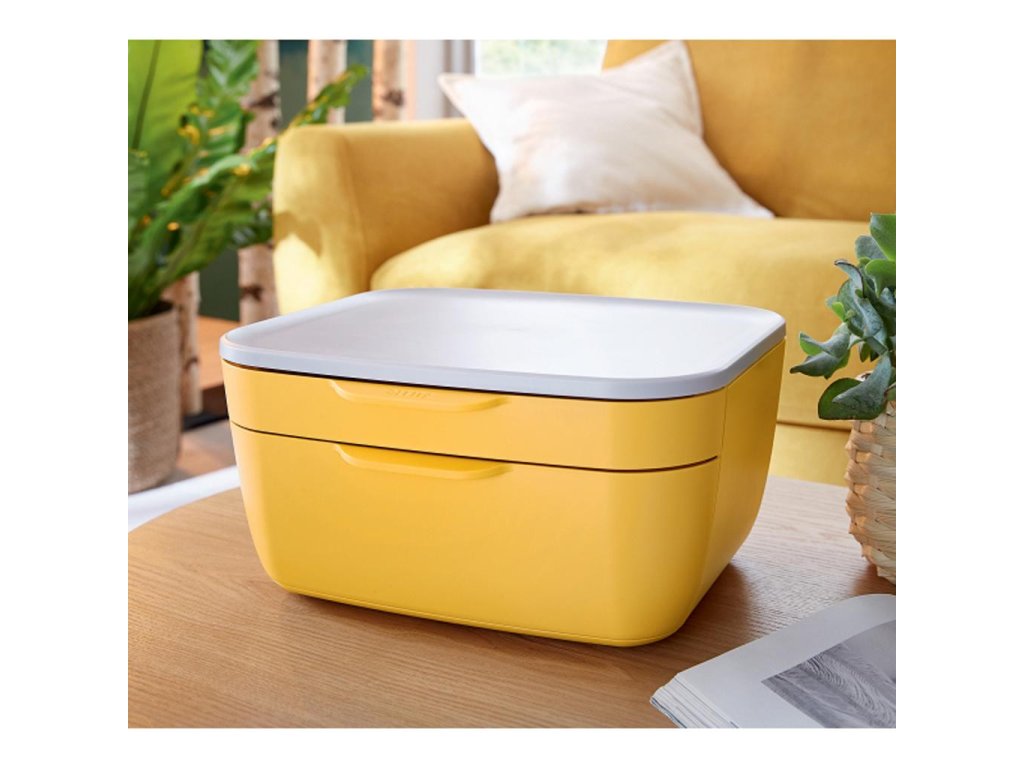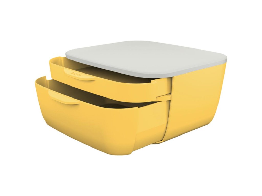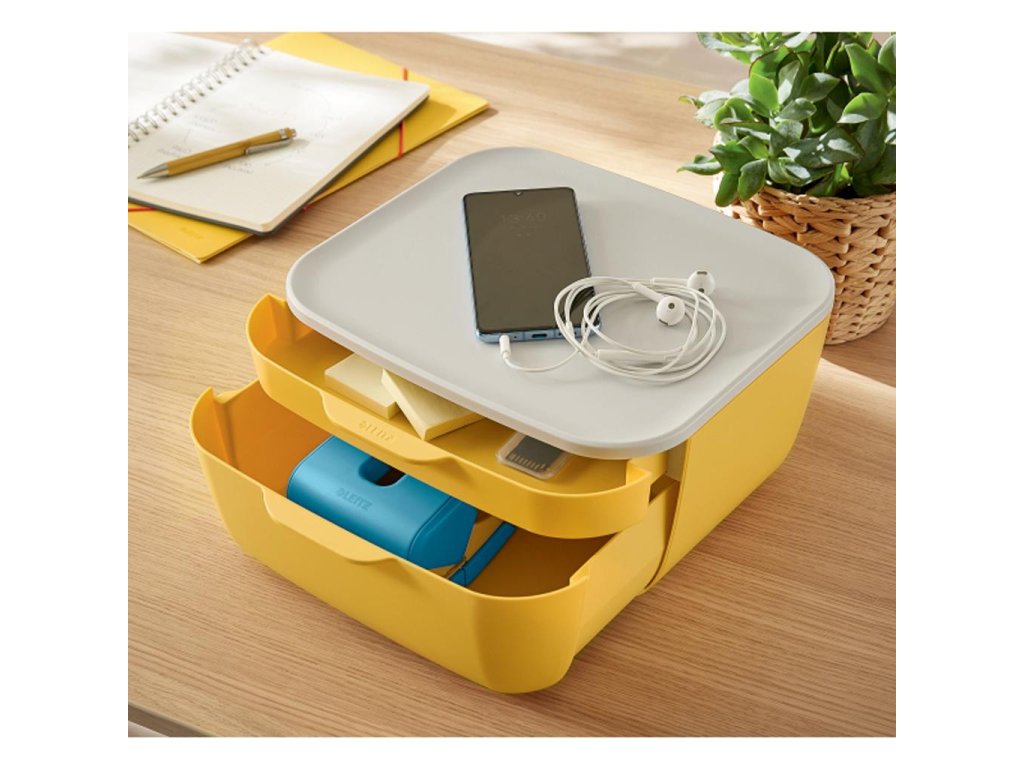 Značková kolekcia Leitz Cosy vám umožní cítiť sa ako doma, nech už vás váš pracovný deň zavedie kamkoľvek. Vďaka minimalistickému dizajnu a lákavej matnej povrchovej úprave pridáte svojmu pracovnému priestoru štýl a farbu. Zásuvkový box Leitz Cosy je ideálny na uloženie všetkých dôležitých vecí, ako sú písacie potreby, bloky a káble. Tento zásuvkový box prvotriednej kvality je perfektný doplnok vášho domova alebo kancelárie, pomôže vám, aby ste nestrácali čas hľadaním drobností a sústredili sa počas dňa na dôležitejšie veci. Zásuvkový box s 2 zásuvkami (1 malá a 1 veľká). Lákavé matné farby s minimalistickým dizajnom. Základňa boxu má veľkosť cca A4. Rozmery 251 x 143 x 275 mm. Farba žltá.Dodatočné parametre