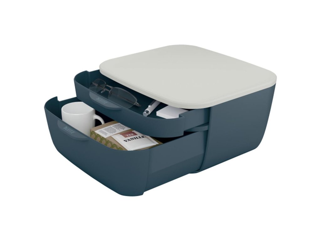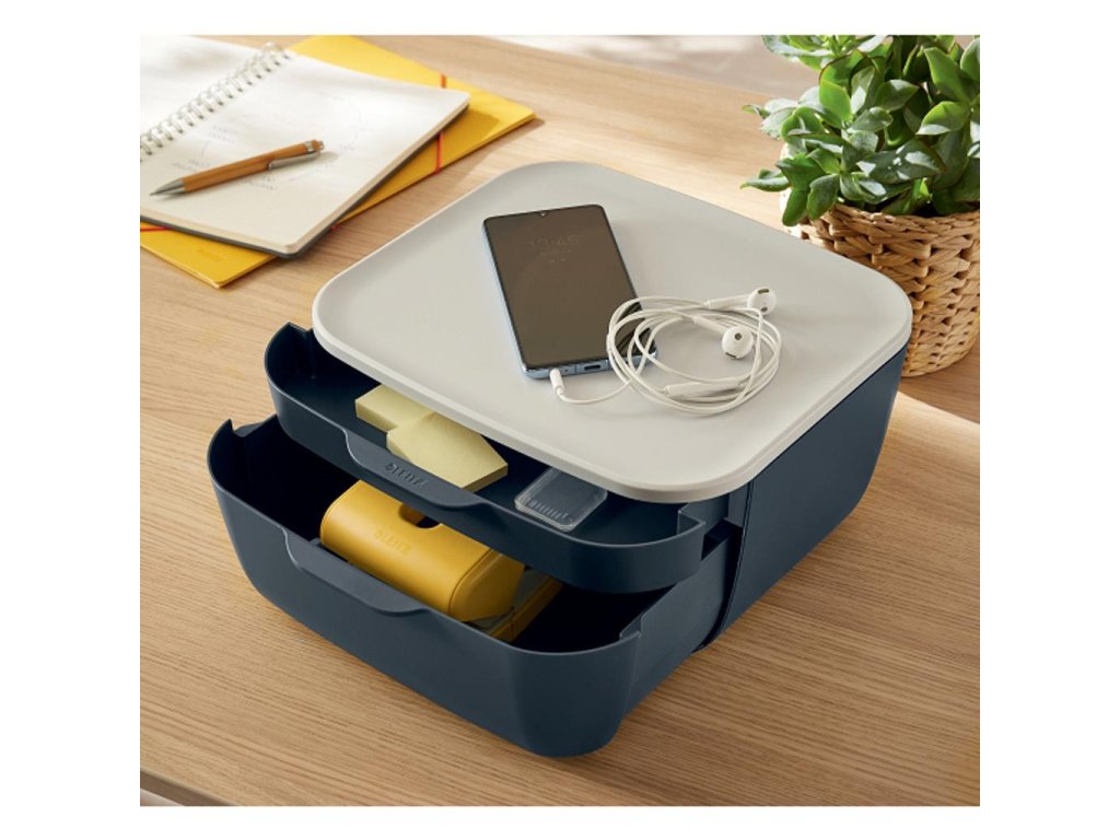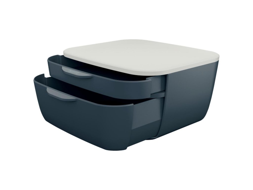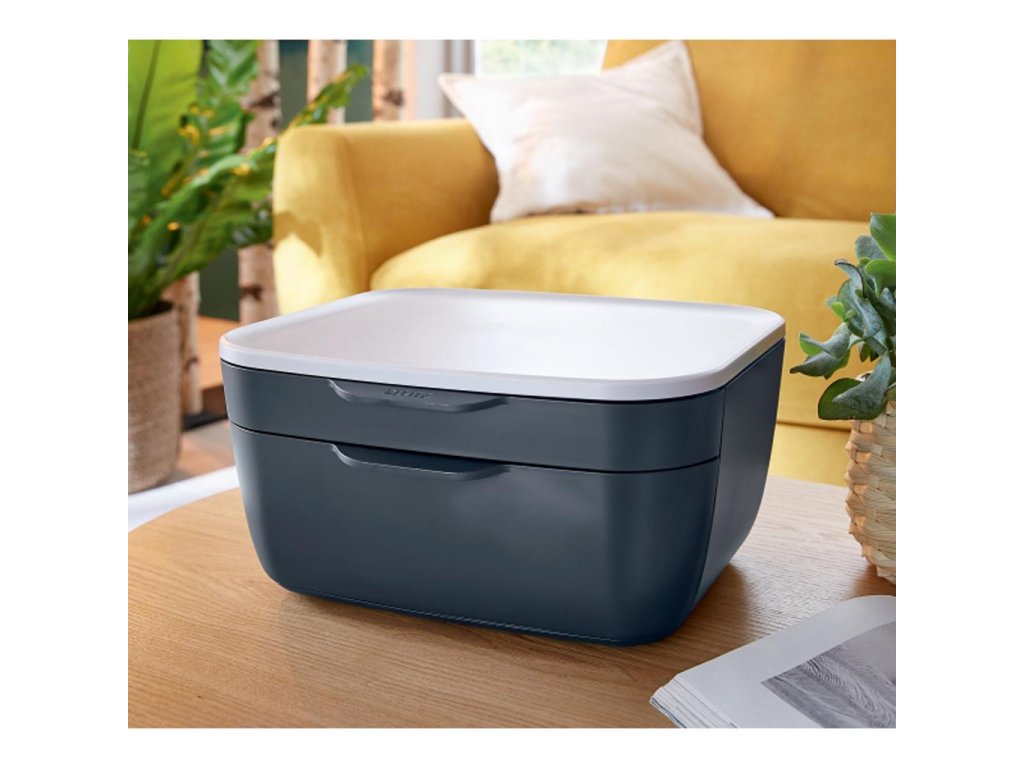 Značková kolekcia Leitz Cosy vám umožní cítiť sa ako doma, nech už vás váš pracovný deň zavedie kamkoľvek. Vďaka minimalistickému dizajnu a lákavej matnej povrchovej úprave pridáte svojmu pracovnému priestoru štýl a farbu. Zásuvkový box Leitz Cosy je ideálny na uloženie všetkých dôležitých vecí, ako sú písacie potreby, bloky a káble. Tento zásuvkový box prvotriednej kvality je perfektný doplnok vášho domova alebo kancelárie, pomôže vám, aby ste nestrácali čas hľadaním drobností a sústredili sa počas dňa na dôležitejšie veci. Zásuvkový box s 2 zásuvkami (1 malá a 1 veľká). Lákavé matné farby s minimalistickým dizajnom. Základňa boxu má veľkosť cca A4. Rozmery 251 x 143 x 275 mm. Farba sivá.Dodatočné parametre