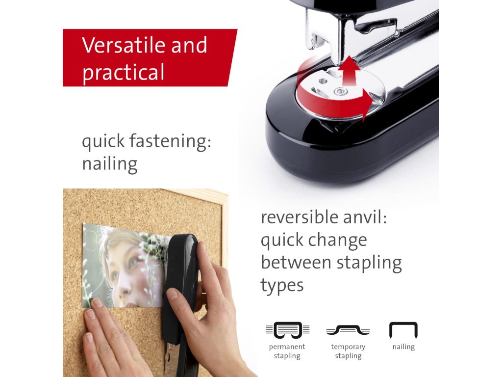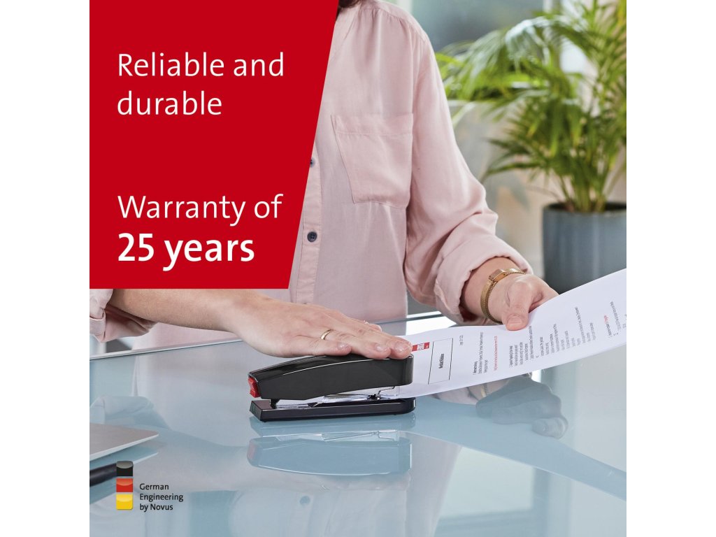 Kompaktná vysokovýkonná zošívačka v kovovom prevedení s plastovým vrchným dielom a dvojitým vedením spiniek. Kapacita náplne 100 spiniek 24/6 - 8 alebo 150 spiniek 26/6 - 8. Hĺbka zošívania 6,5 cm. Hmotnosť 245 g. Záruka 25 rokov.Farba: čierna