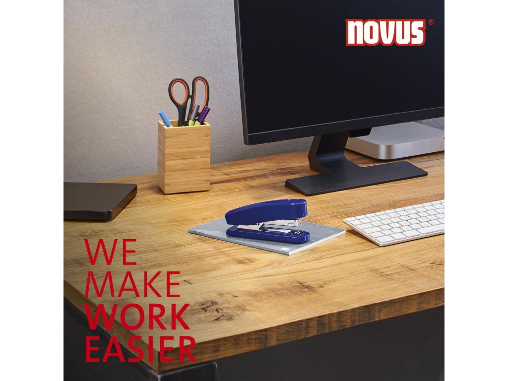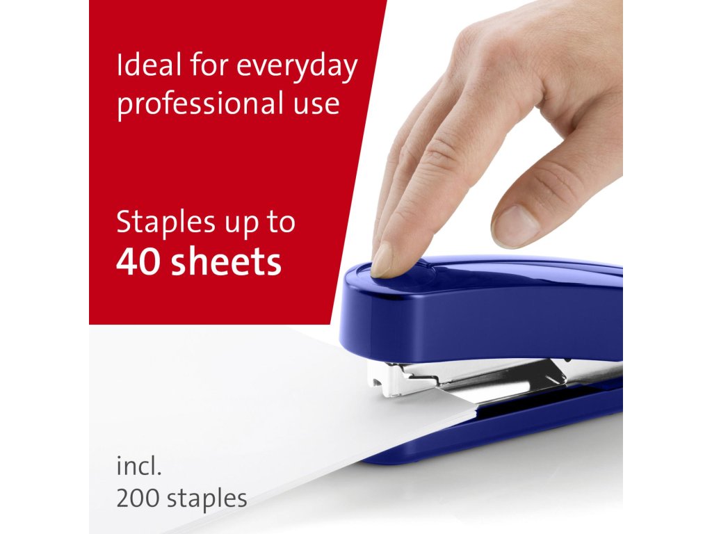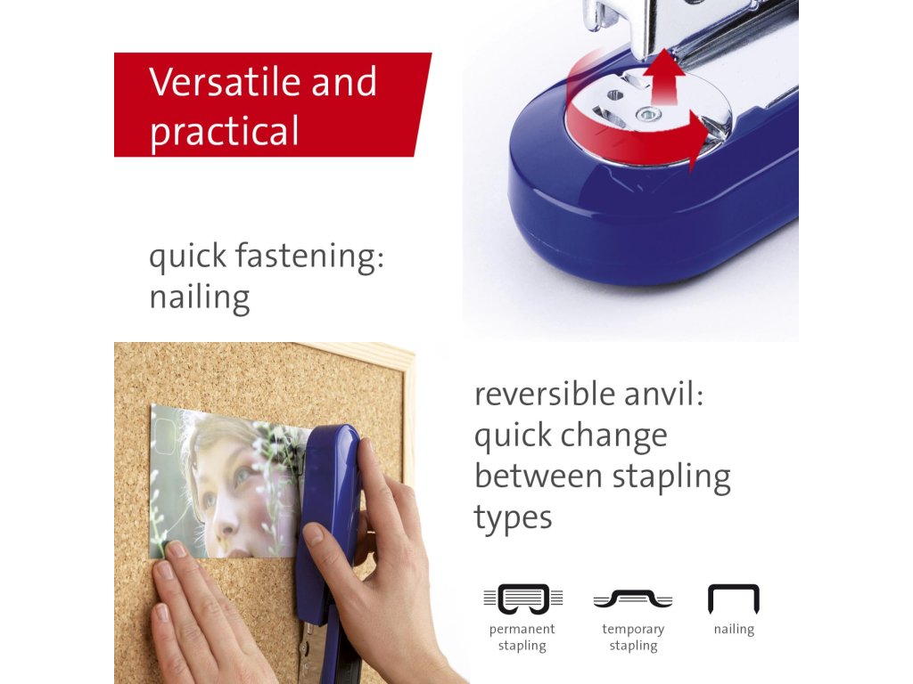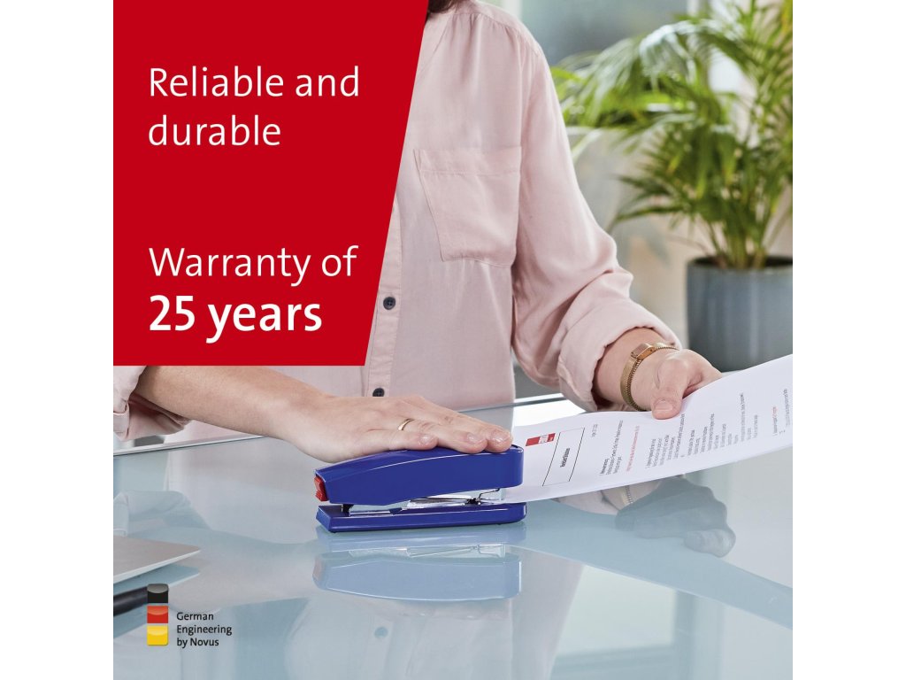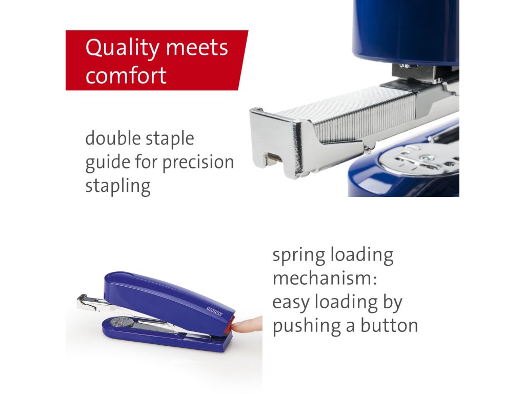 Kompaktná vysokovýkonná zošívačka v kovovom prevedení s plastovým vrchným dielom a dvojitým vedením spiniek. Kapacita náplne 100 spiniek 24/6 - 8 alebo 150 spiniek 26/6 - 8. Hĺbka zošívania 6,5 cm. Hmotnosť 245 g. Záruka 25 rokov.Farba: modrá