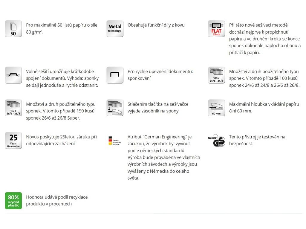 Celokovová kancelárska zošívačka pre každodenné profesionálne použitie z kolekcie šetrnej k životnému prostrediu re+new, s lesklým plášťom z 81% recyklovaného plastu. Dvojité vedenie spiniek, kapacita náplne 100 spiniek 24 / 6 - 8 alebo 150 spiniek 26 / 6 - 8. Hĺbka zošívania 6,5 cm. Hmotnosť 245 g. Záruka 25 rokov. Súčasťou balenia je 200 spiniek 24 / 6 DIN SUPER. Kapacita 40 listov. Farba čierna.Dodatočné parametre