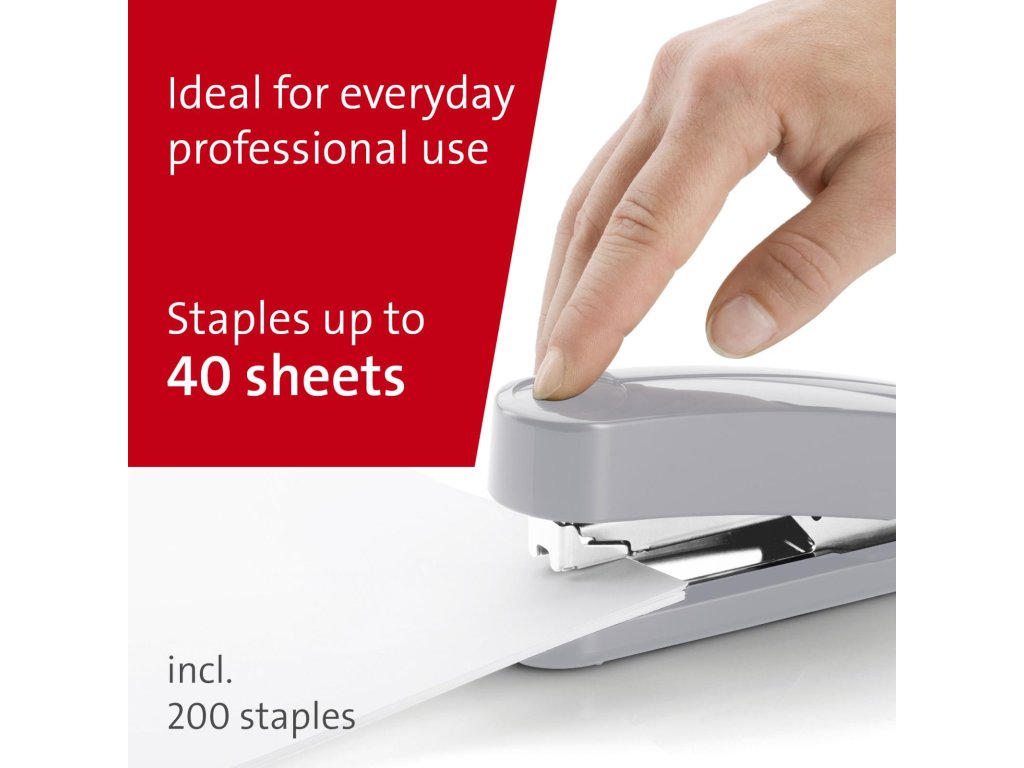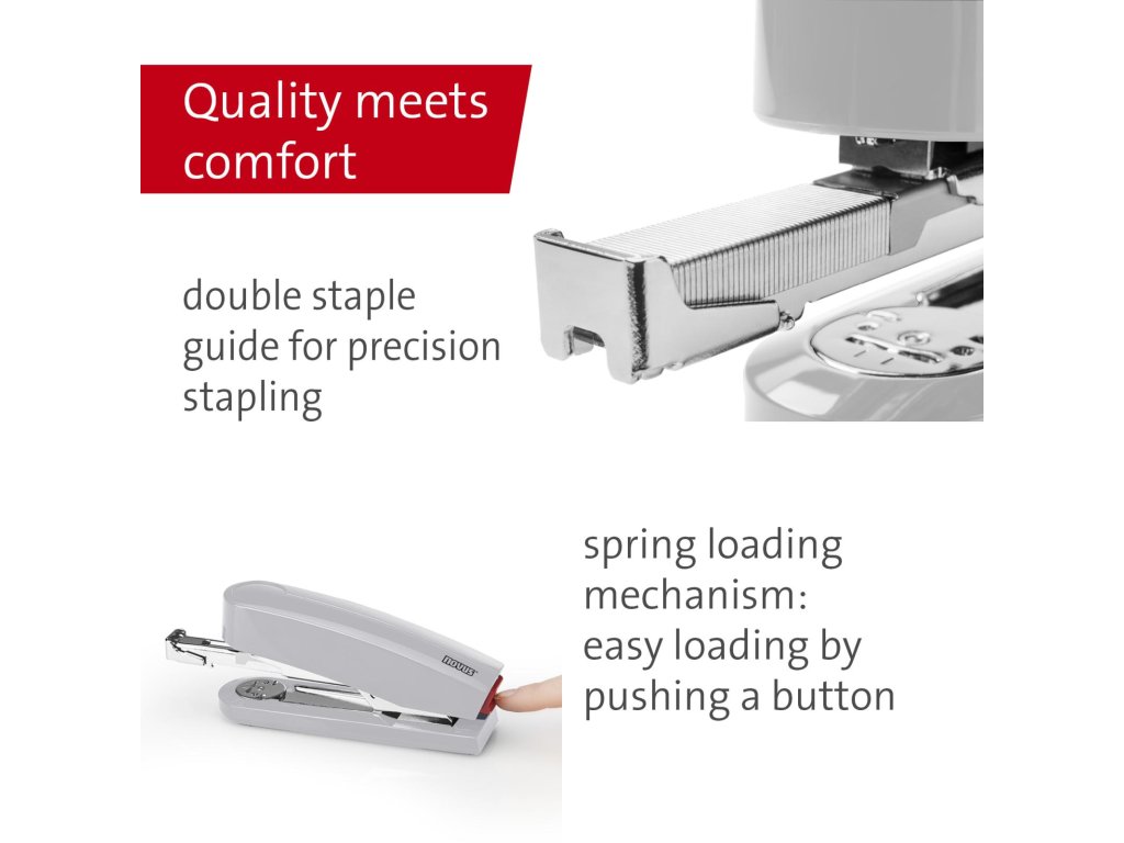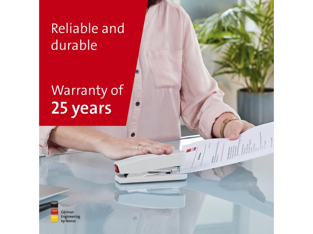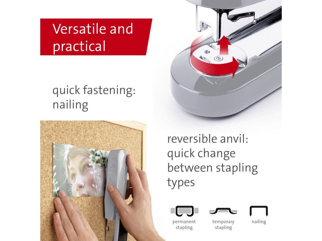 Kompaktná vysokovýkonná zošívačka v kovovom prevedení s plastovým vrchným dielom a dvojitým vedením spiniek. Kapacita náplne 100 spiniek 24/6 - 8 alebo 150 spiniek 26/6 - 8. Hĺbka zošívania 6,5 cm. Hmotnosť 245 g. Záruka 25 rokov.Farba: sivá