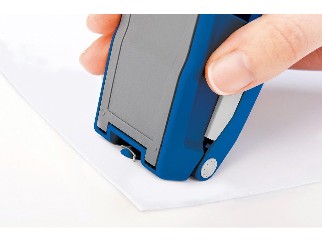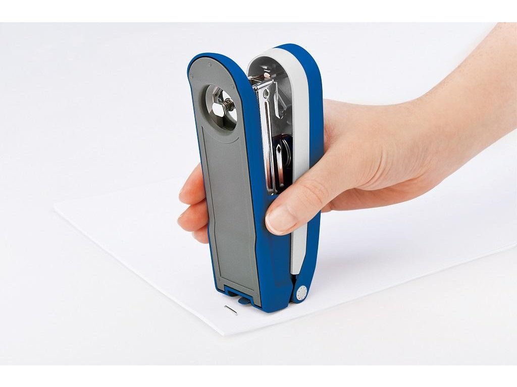 Užitočná celokovová kancelárska zošívačka na každý písací stôl z kolekcie Evolution so stabilnou protišmykovou spodnou časťou. Plastový vrchný diel, integrovaná plastová rozošívačka na zadnej časti, otočná matrica pre otvorený a uzavretý spôsob zošívania. Kapacita náplne 100 spiniek veľkosti 24/6, resp. 150 spiniek veľkosti 26/6. Kapacita zošitia 25 listov papiera. Hĺbka zošívania 5,3 cm. Hmotnosť cca 165 g. Záruka 10 rokov. Farba modrá/sivá.Dodatočné parametre